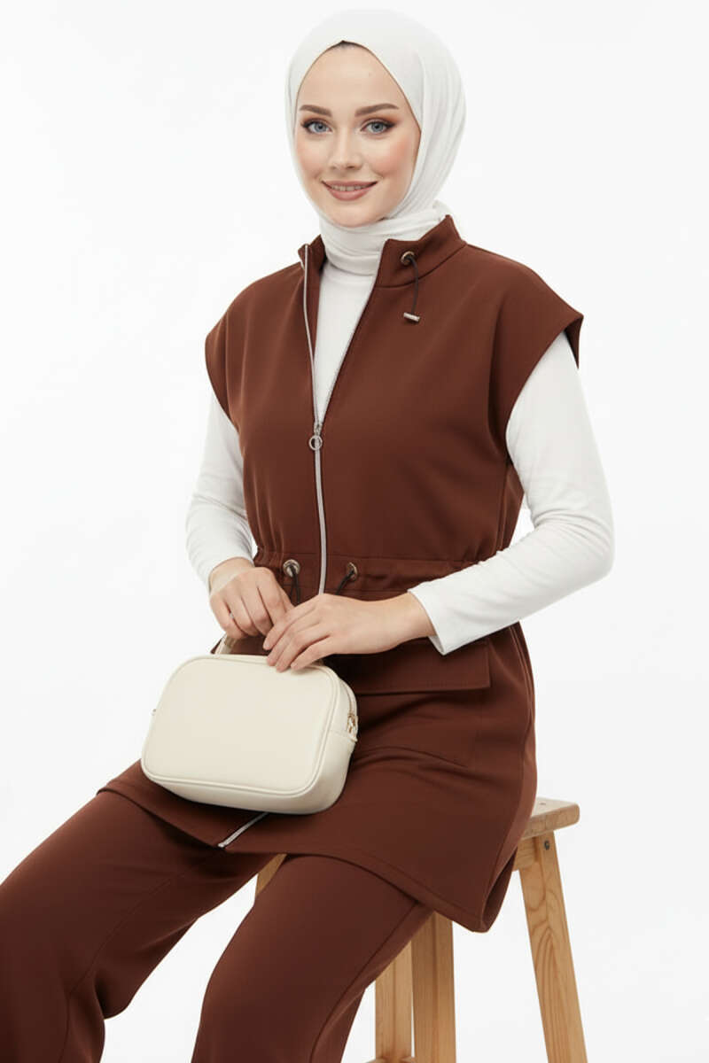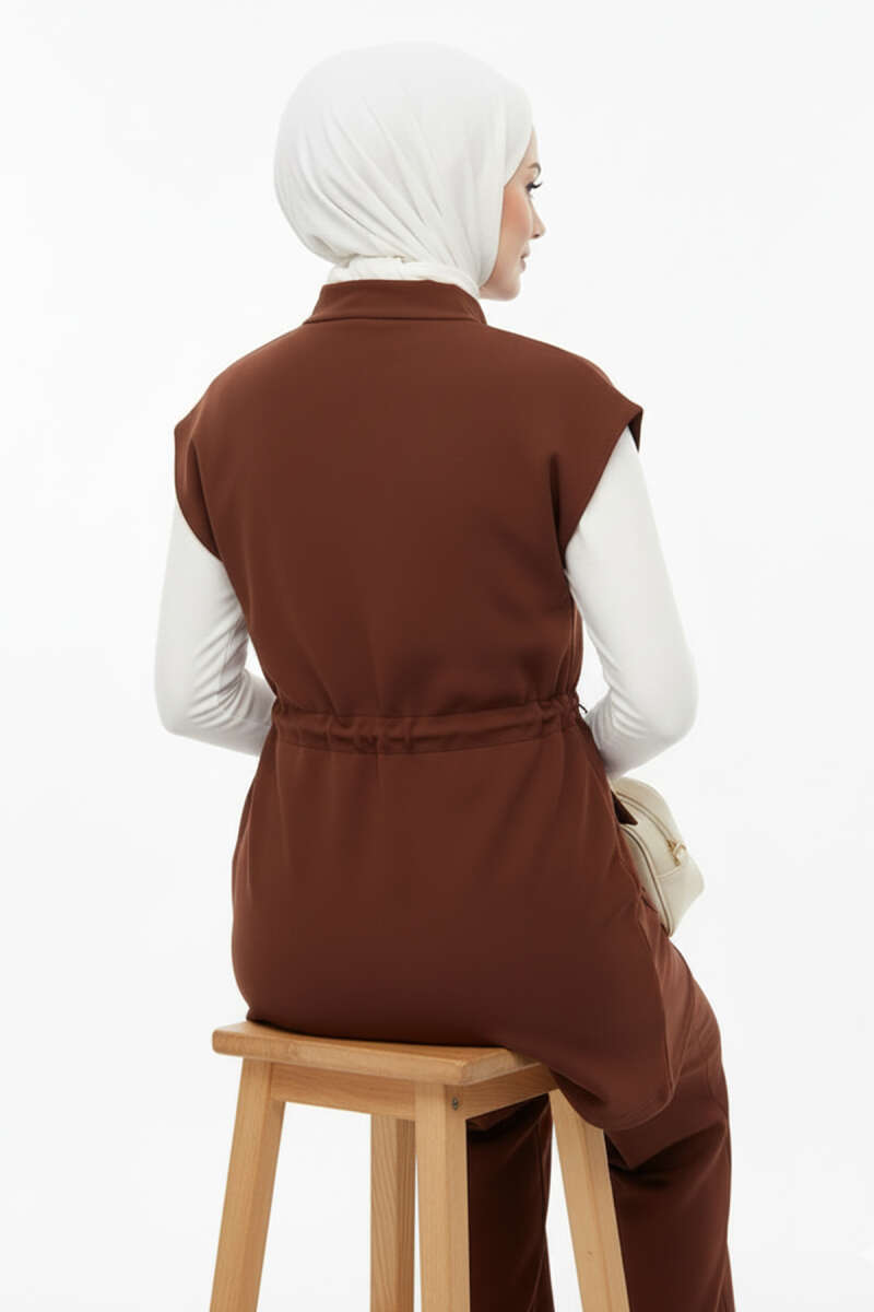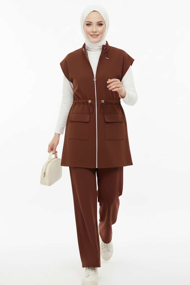 Önü Pileli Kemerli Scuba İkili Takım Kahve
