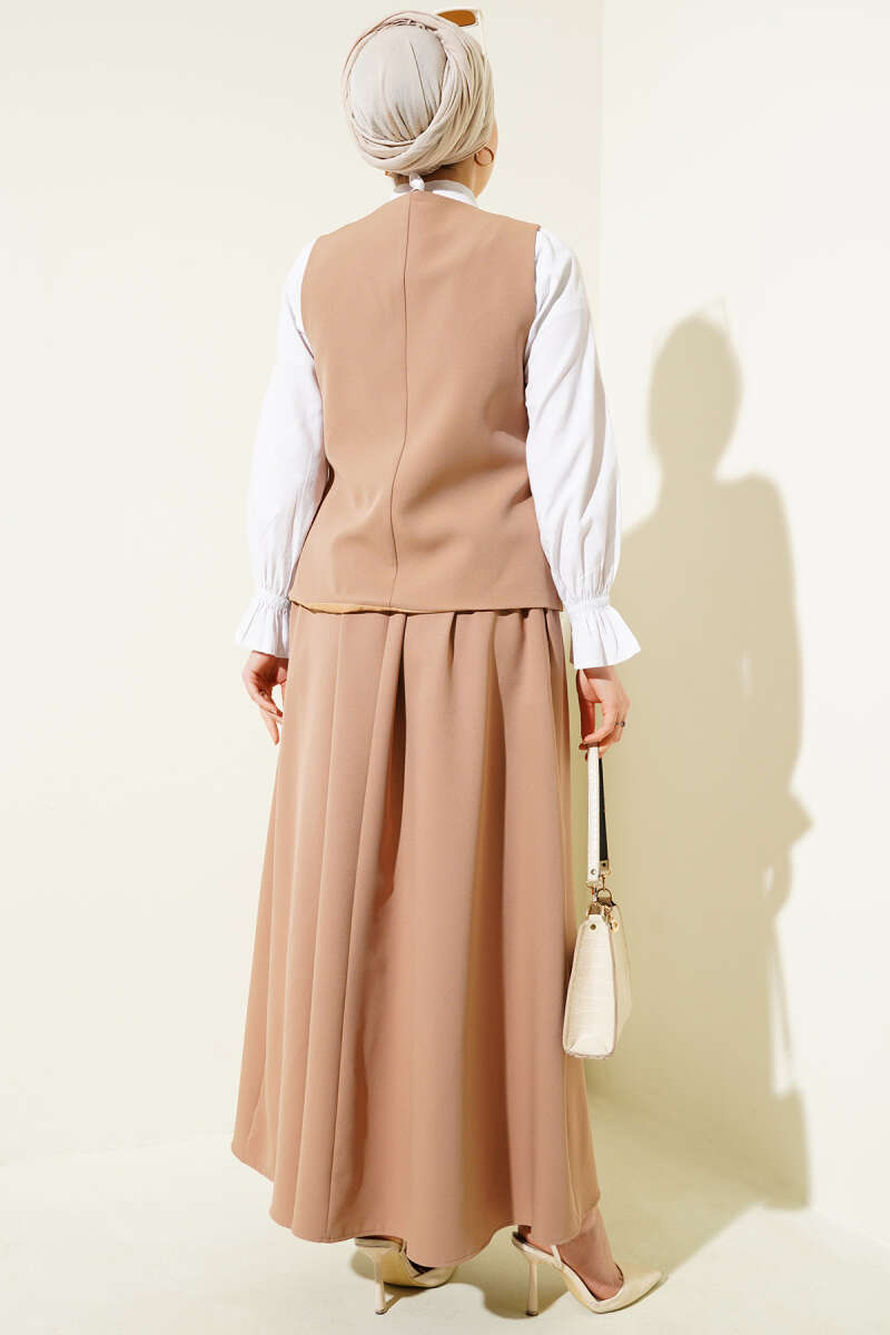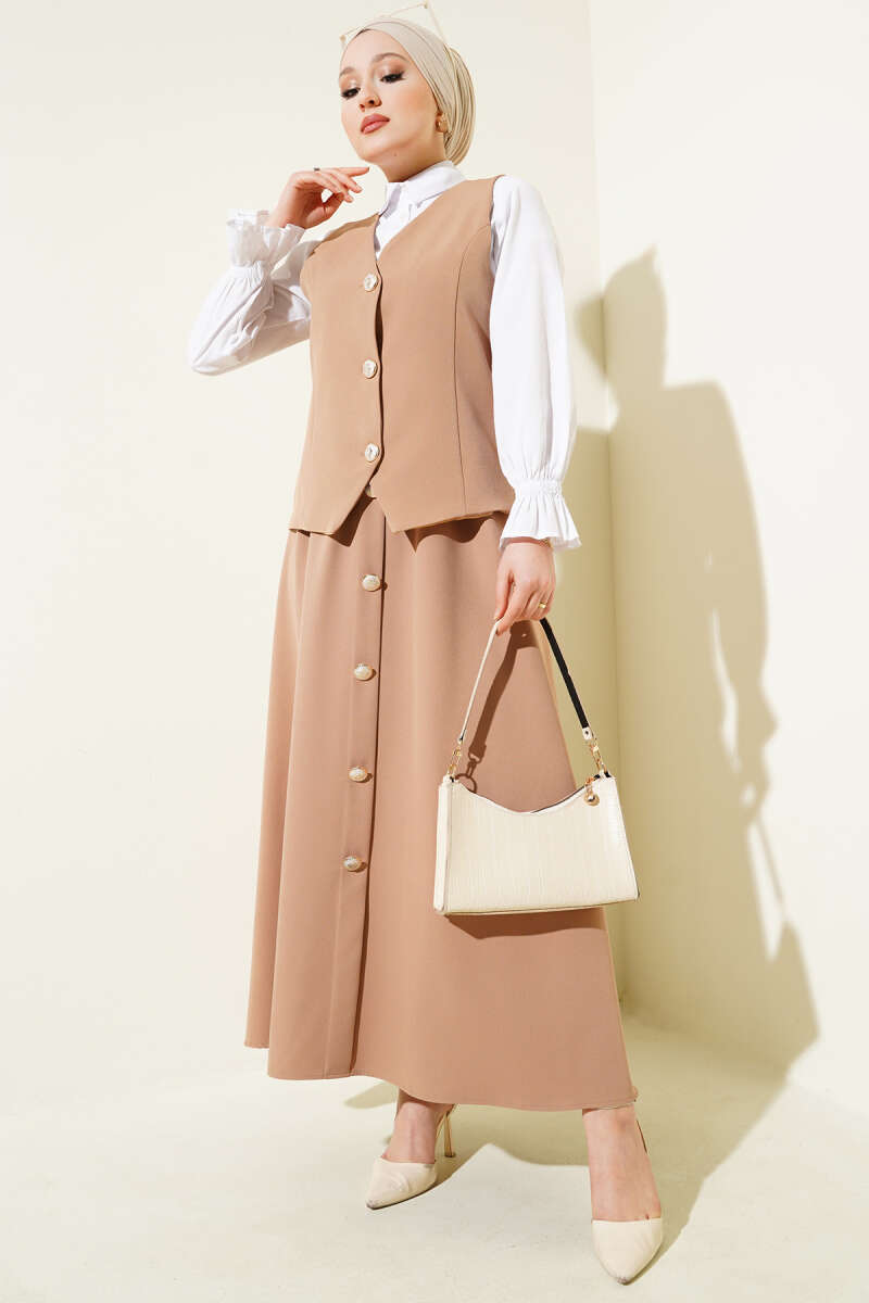 Yelekli Düğme Detaylı Etekli Takım Camel