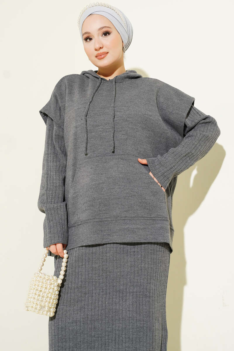 Yelekli Jile Elbise Triko İkili Takım Gri