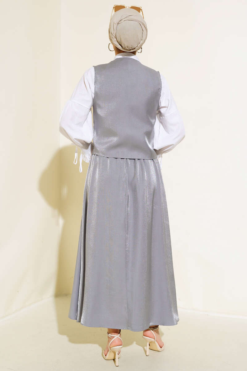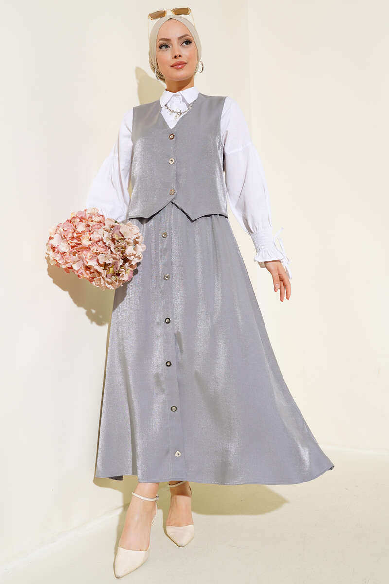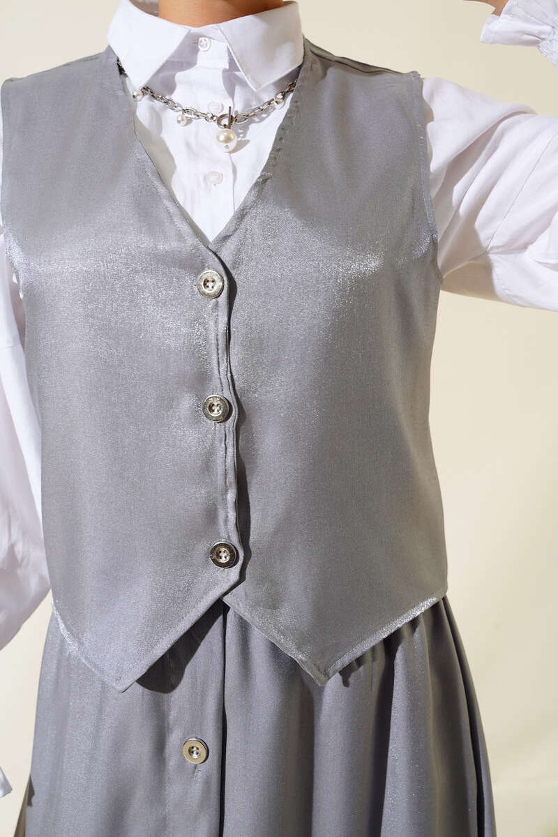 Yeni sezon ikili takım modelimiz sizlerle beraber. Yeleğimizin önü düğmelidir. Kısa modeldir. Eteğimizin beli lastiklidir. Önünde boydan düğme süsü vardır. Astarsız modeldir. Hem şık hem zarif takımımız size çok yakışacak.