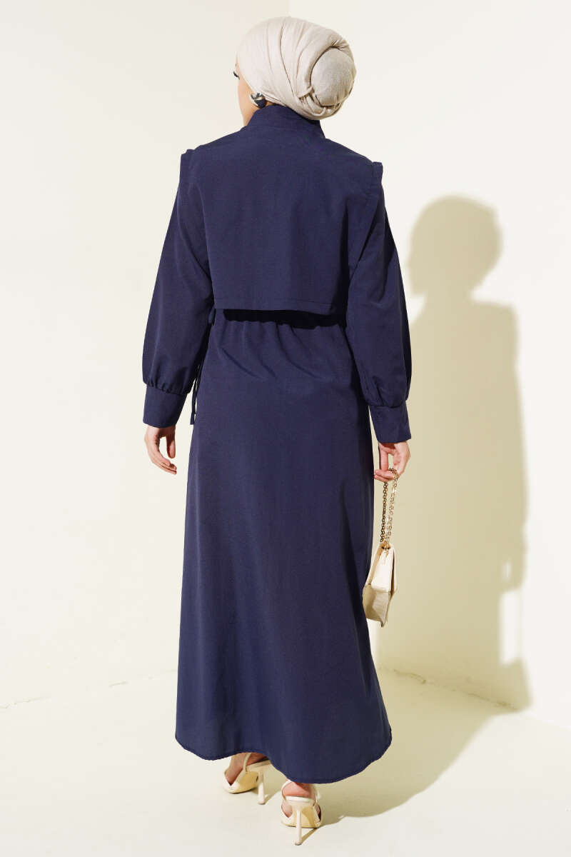 Kuşaklı Dik Fitilli Kaşe Elbise Lacivert