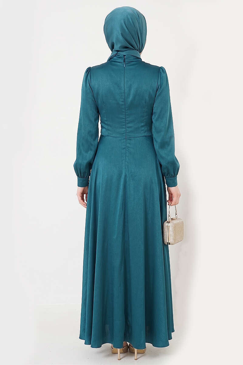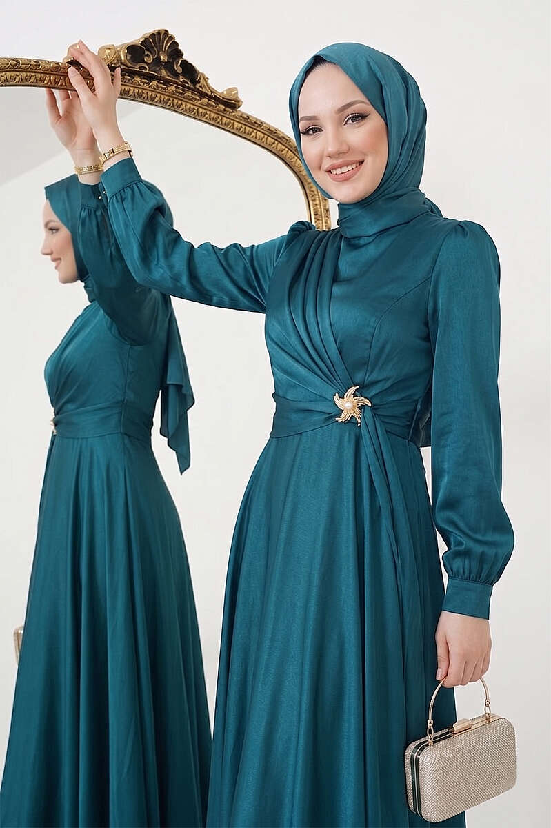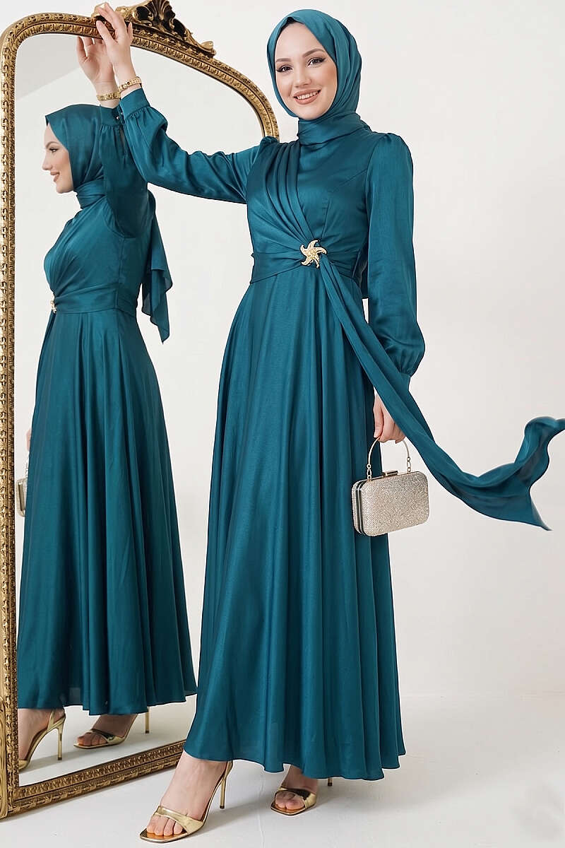 Yıldız Gold Toka Detaylı Saten Abiye Elbise Petrol