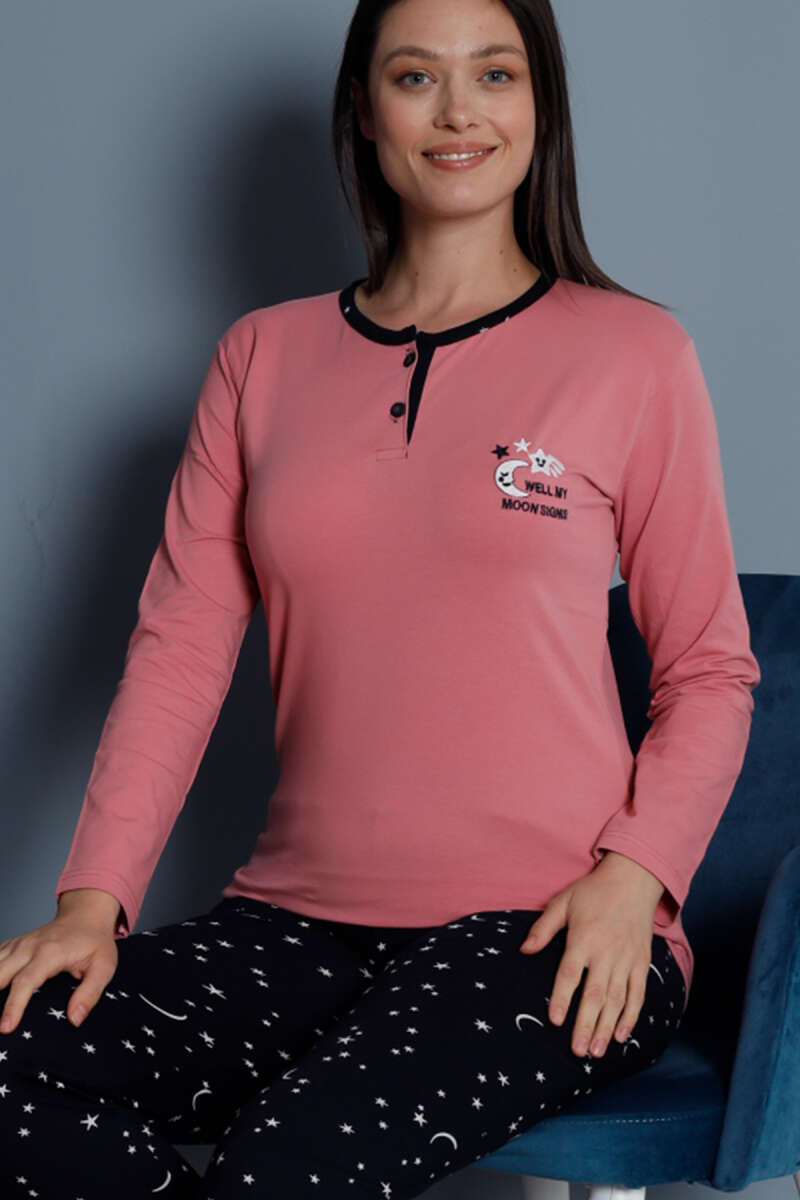Yıldız Nakışlı Uzun Kol Pijama Takımı Nar Çiçeği