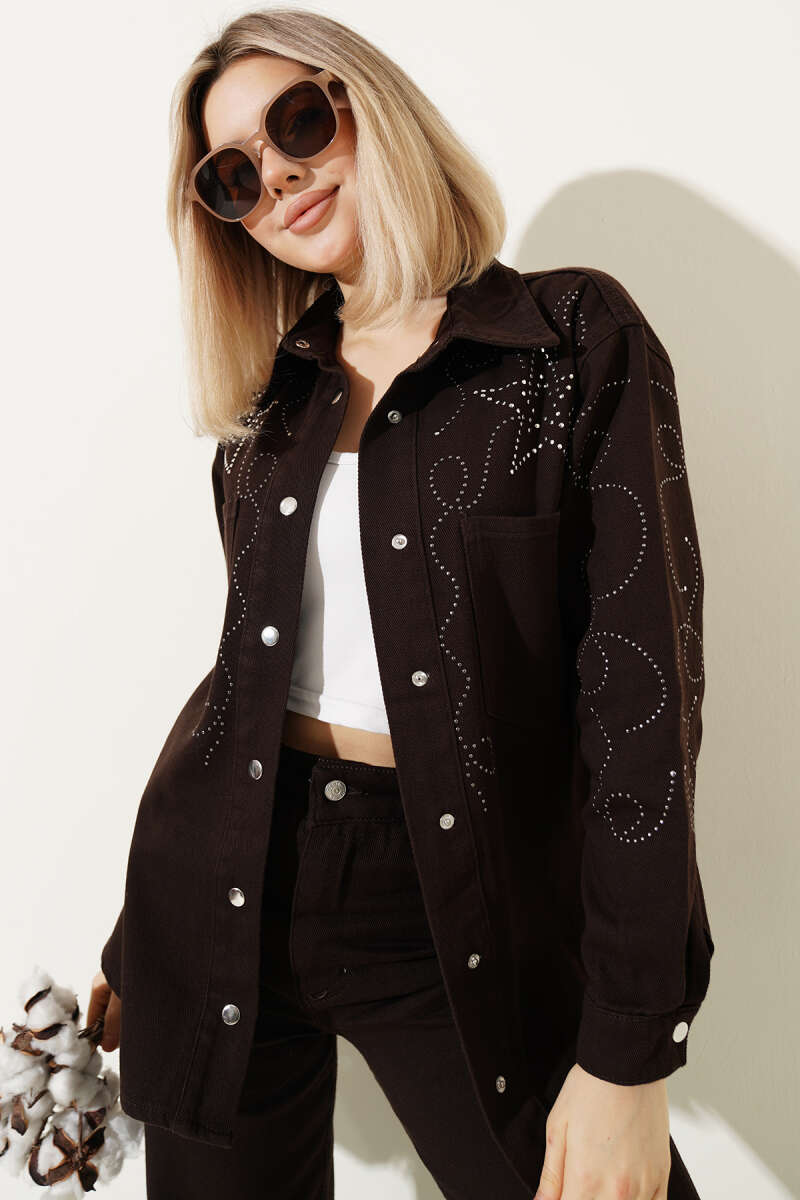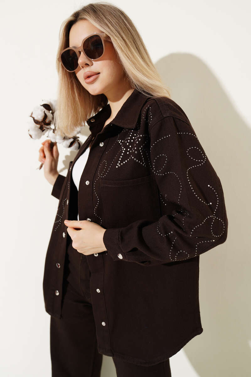 Yıldız Taşlı Cepli Gabardin Ceket Kahve