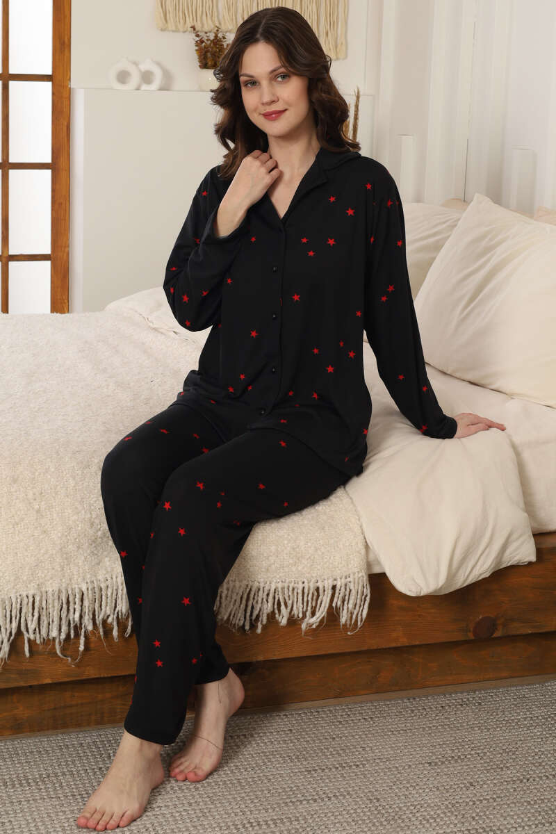 Yıldızlı Kruvaze Yaka Pijama Takımı Siyah