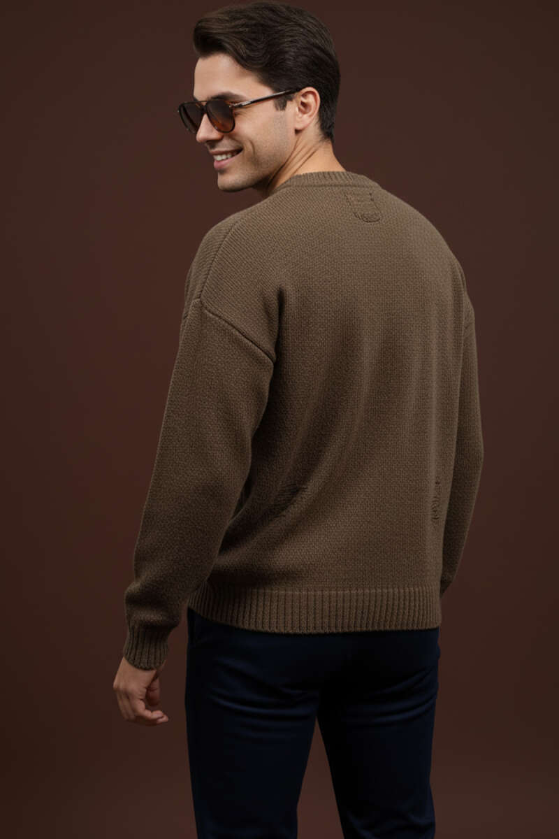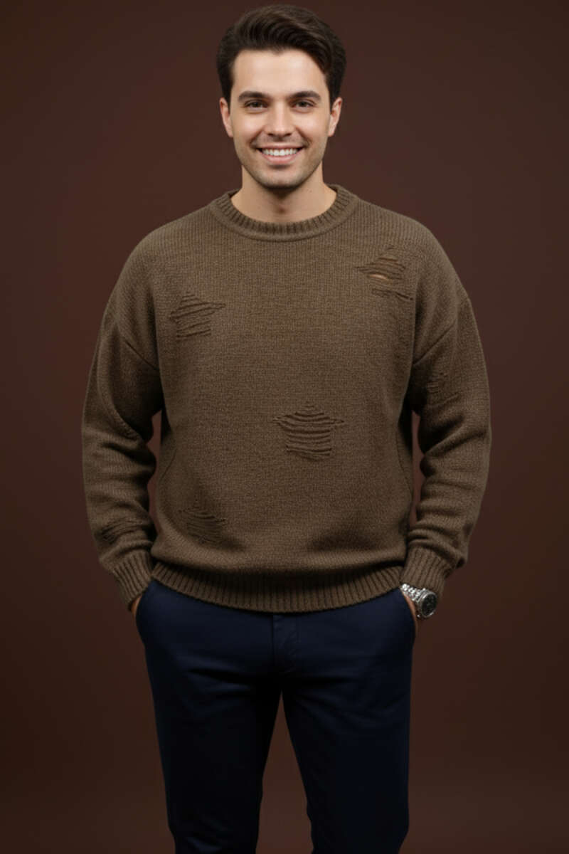 Yıpratma Detaylı Triko Erkek Kazak Kemik