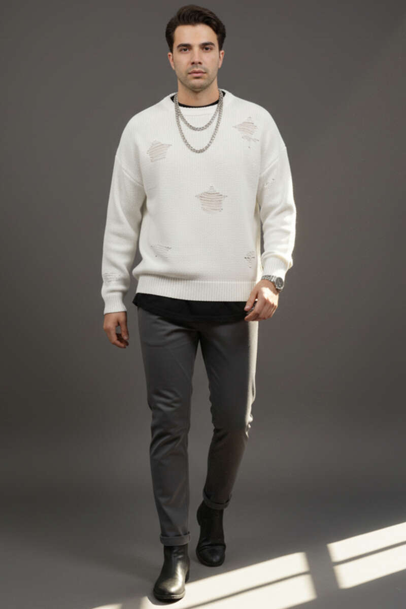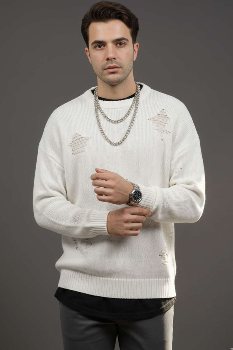Yıpratma Detaylı Triko Erkek Kazak Gri