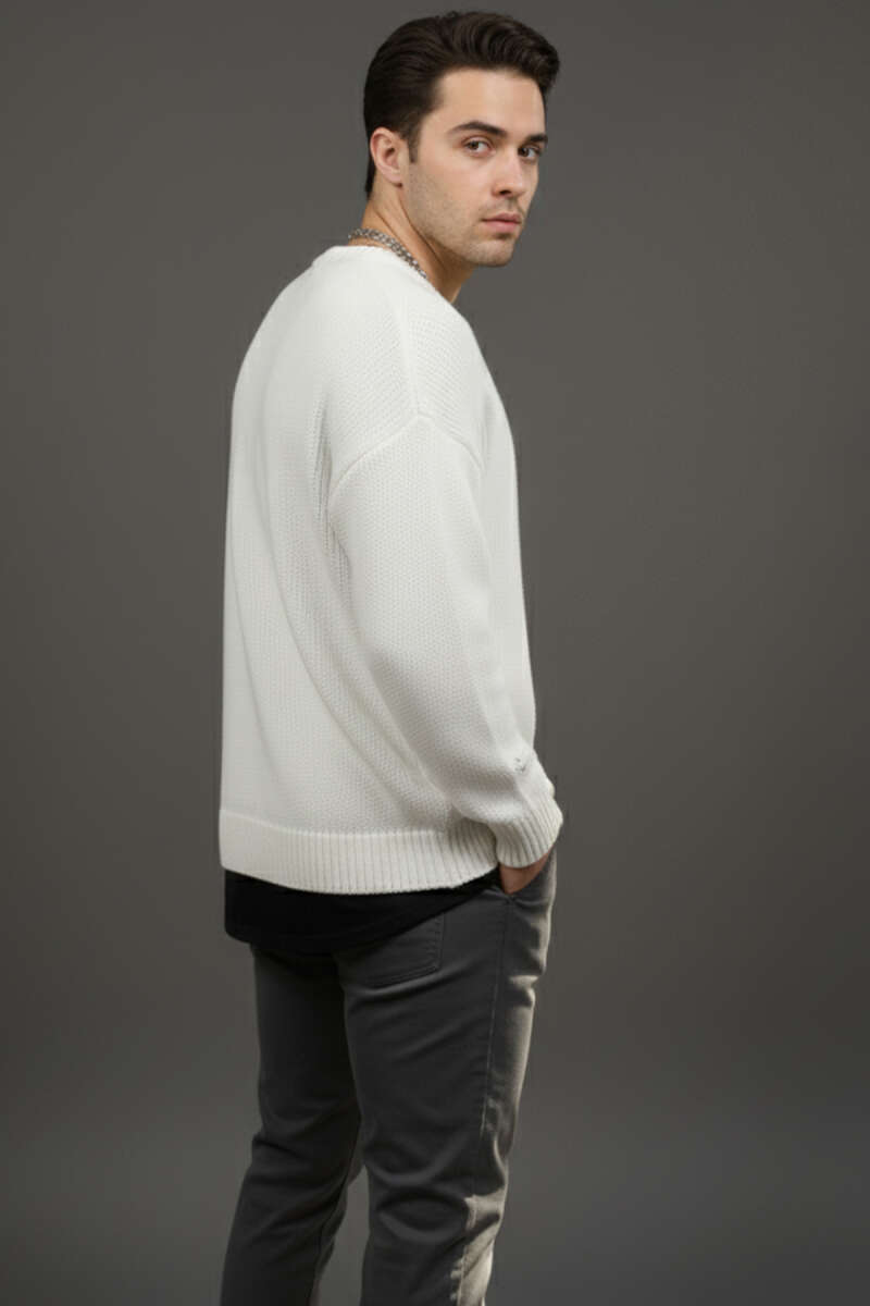 Yaka Fermuarlı Triko Erkek Kazak Beyaz