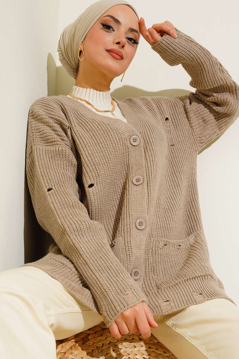 Sezonun çarpıcı parçası olan hırkamızı çok beğeneceksiniz. Yırtık detaylarıyla hareketlilik kazanan hırkamız boydan düğmeli modeldir. İki adet cebi olan hırkamız salaştır. Omuzları düşüktür.