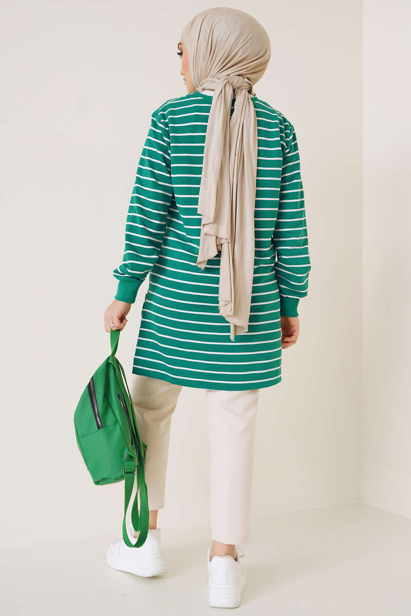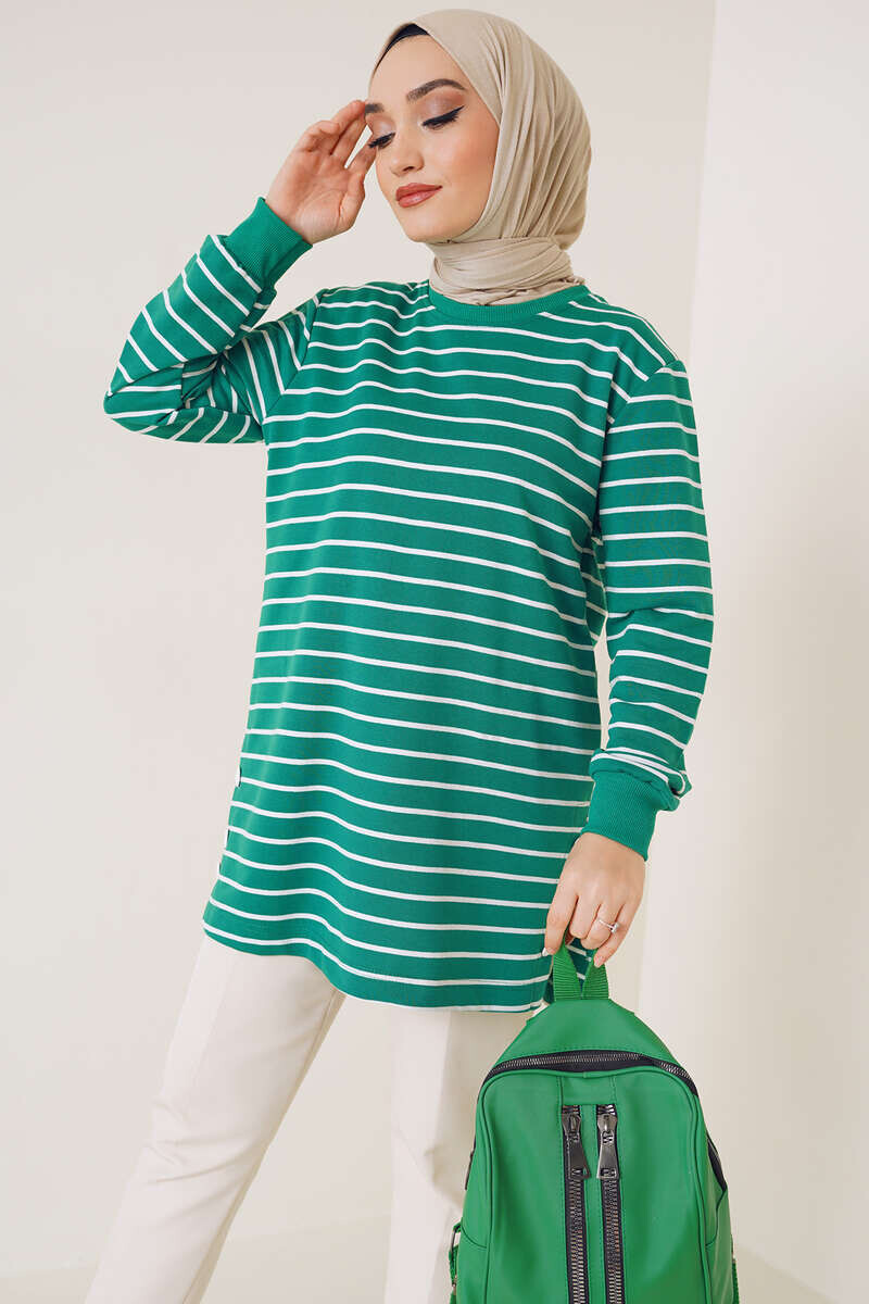 Yırtmaç Düğme Detaylı Çizgili Tunik Yeşil