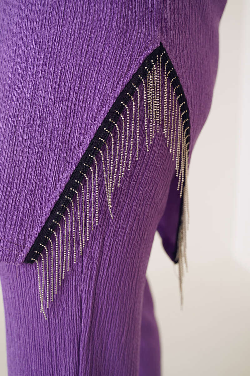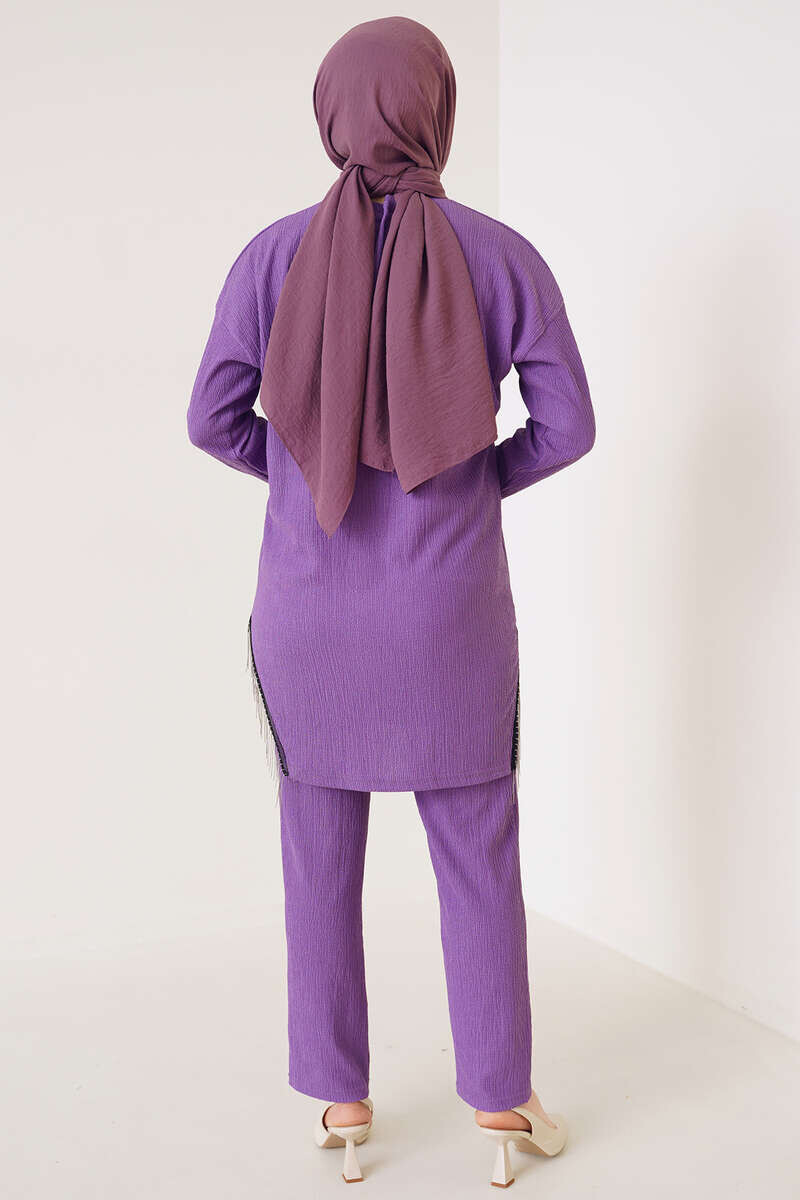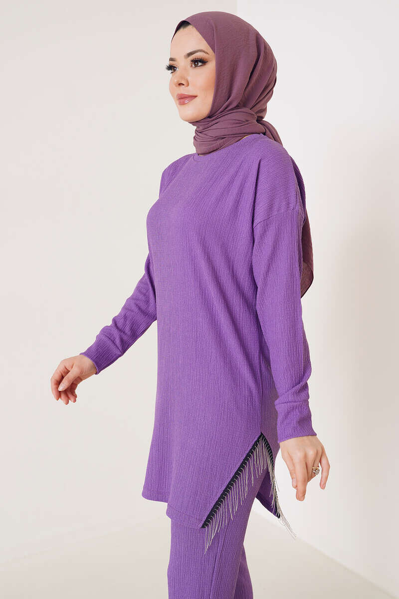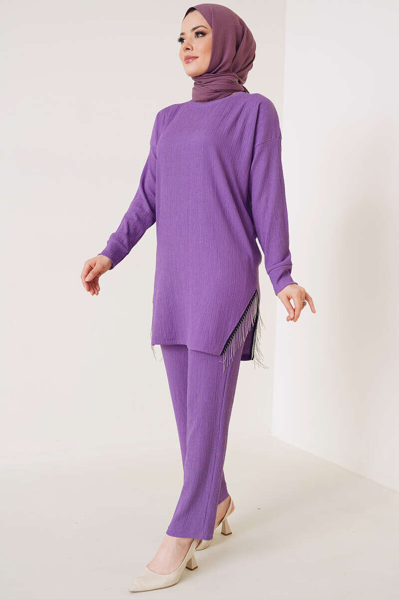 Yeni sezon bürümcük ikili takımımızın tuniği yırtmaçlarında bulunan zincir püskülleriyle beğenileri toplamakta. Düşük omuz model olan tuniğimiz bisiklet yakadır. İkili takımımızın pantolonu cepsiz modeldir. Beli lastiklidir.