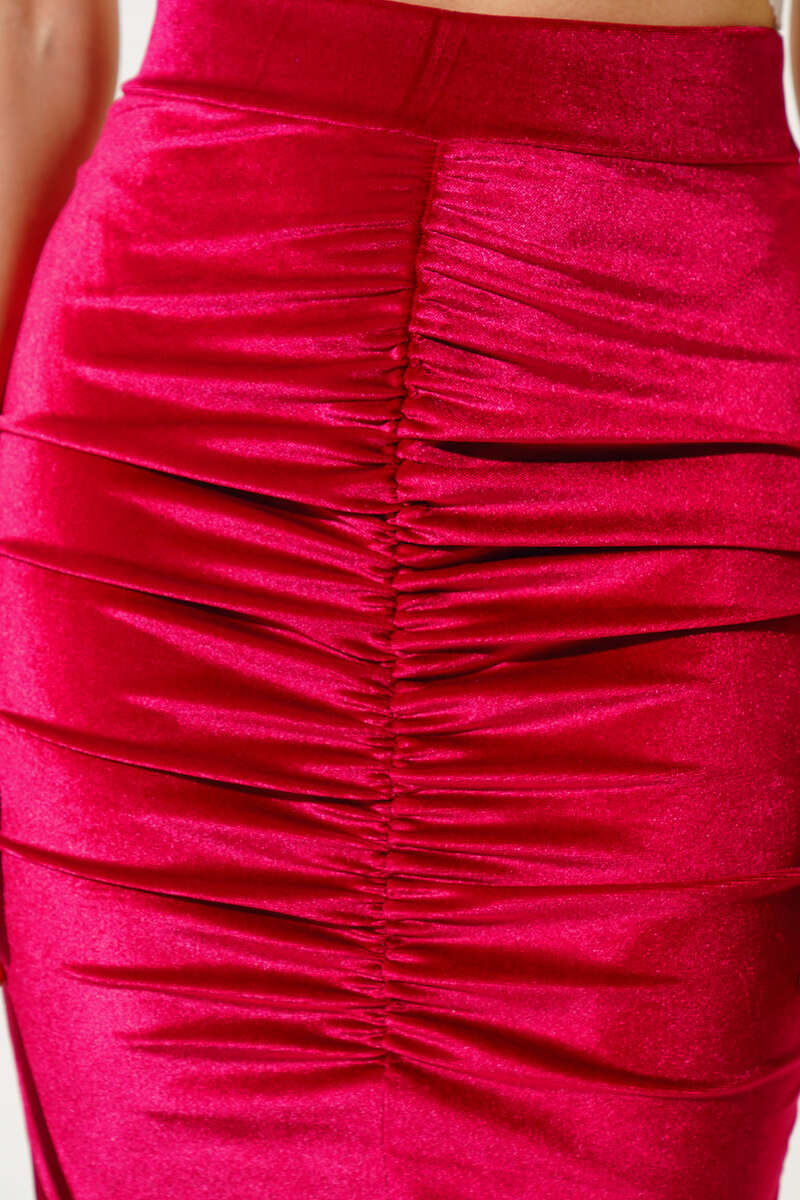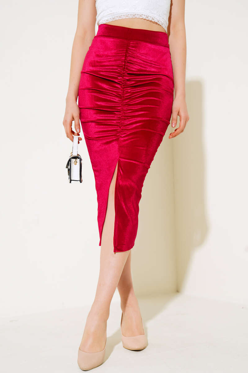 Yeni sezon eteğimiz sizlerle beraber. Kadife eteğimizin önü büzgülüdür. Yırtmaçlı model olan eteğimiz kadife kumaştır. Kombinlerinizin yıldız parçası olan kadife eteğimizi çok seveceksiniz.