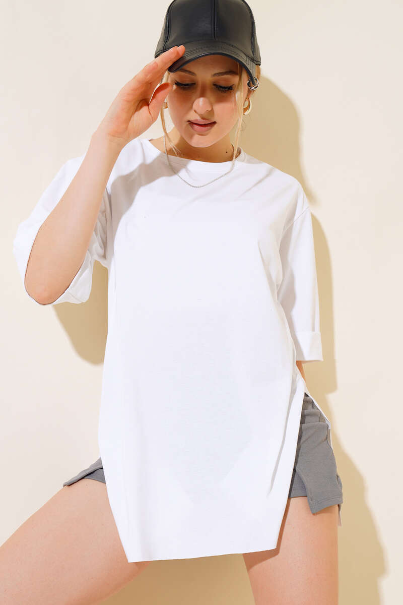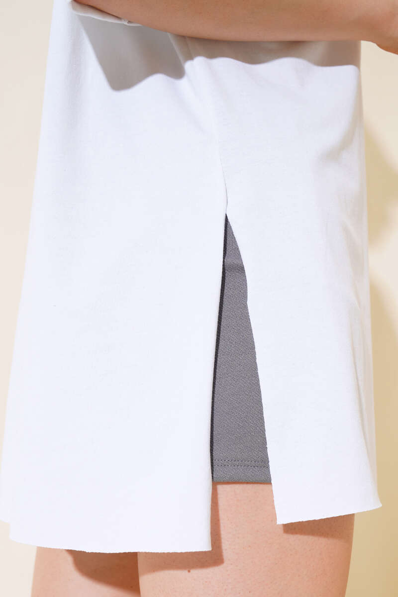 Yırtmaçlı Duble Kol T-shirt Beyaz