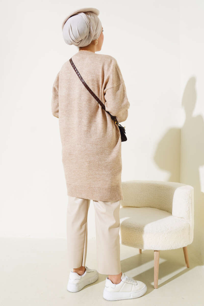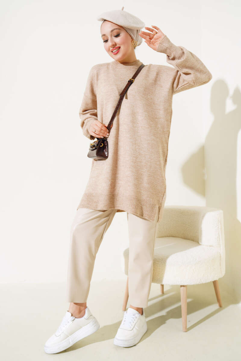 Gömlek Yaka Çizgili Triko Tunik Bej