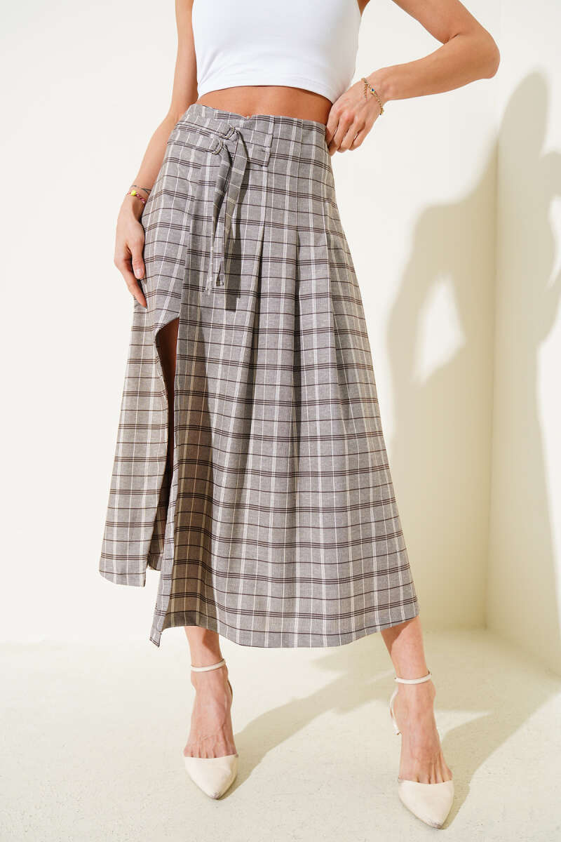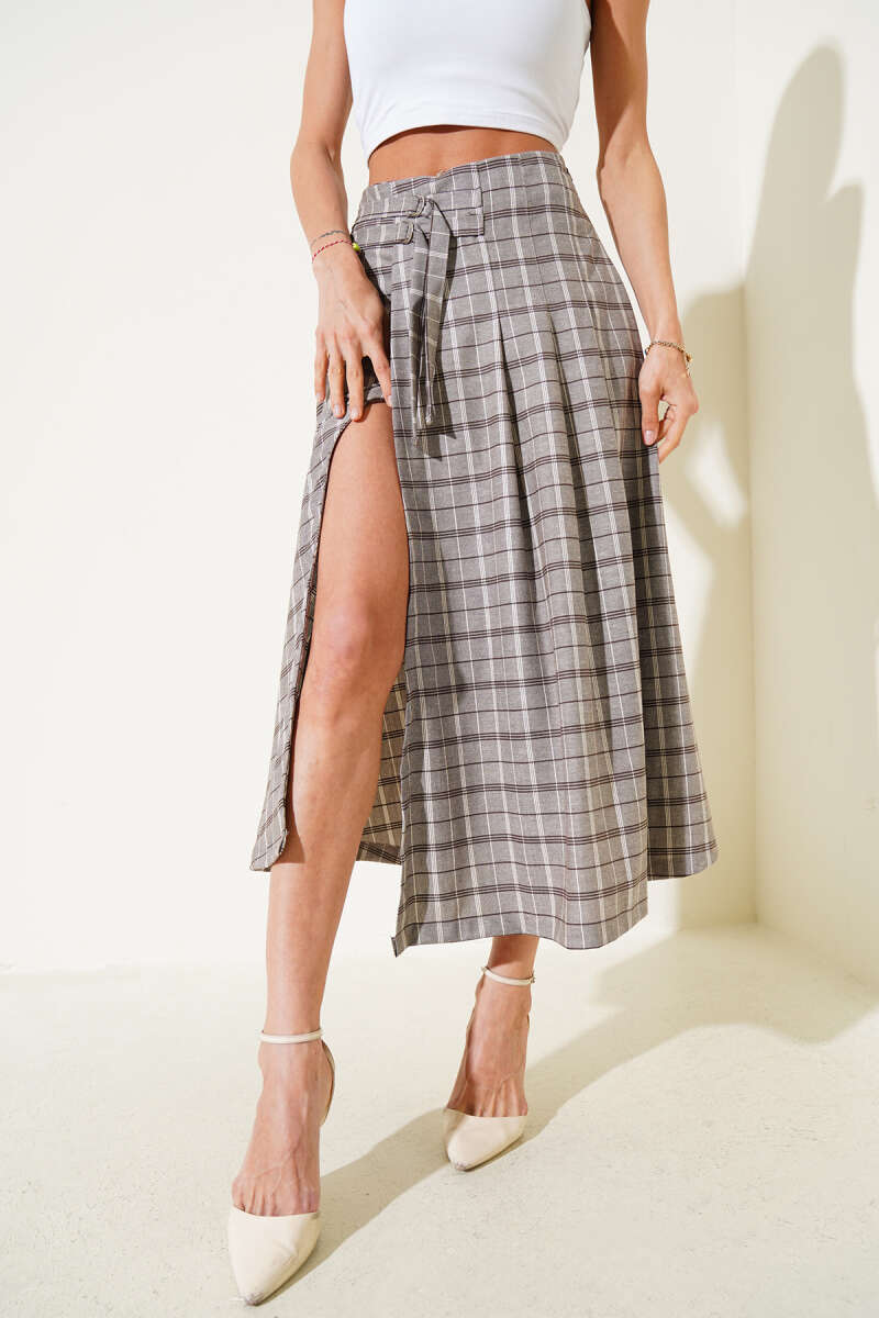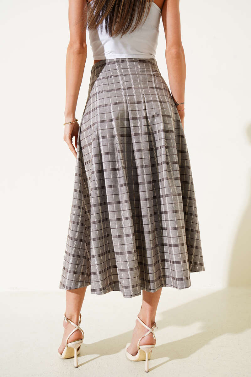 Yırtmaçlı Ekose Desenli Midi Etek Vizon