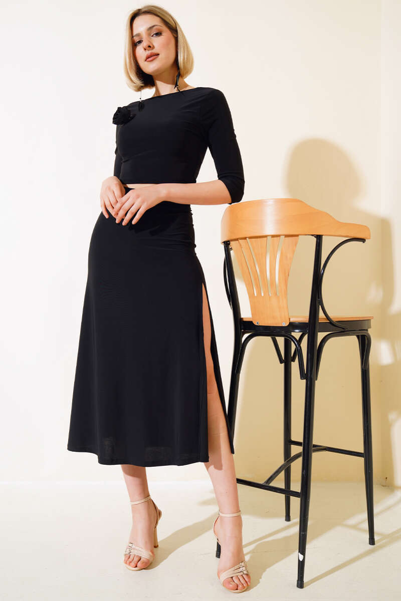 Omuz Vatkalı Yırtmaçlı Elbise Sarı