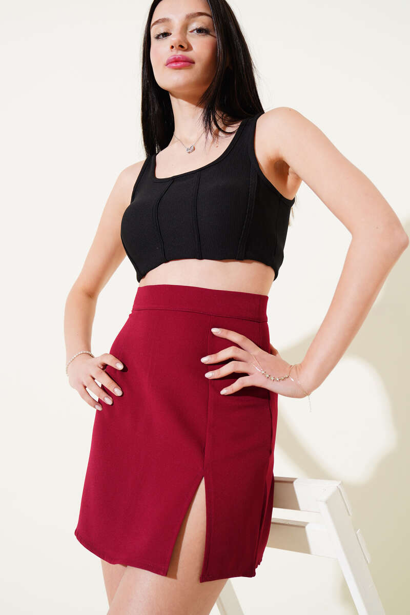 Yırtmaçlı Fermuarlı Mini Etek Bordo