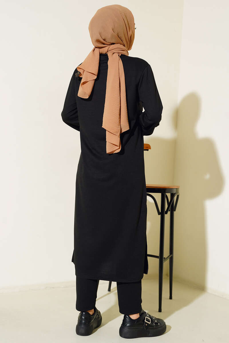 Yeni sezon ikili takımımız sportif tarzıyla sezonun favorileri arasında yerini alacaktır. Tuniğimizin etek ucu yanlardan yırtmaçlıdır. Kol bilekleri lastiklidir. Düşük omuzludur. Tuniğimiz uzun boydur. Pantolonumuzun beli lastiklidir. Rahat ve sportif olan modelimiz dolaplarınızda yerlerini beklemektedir.