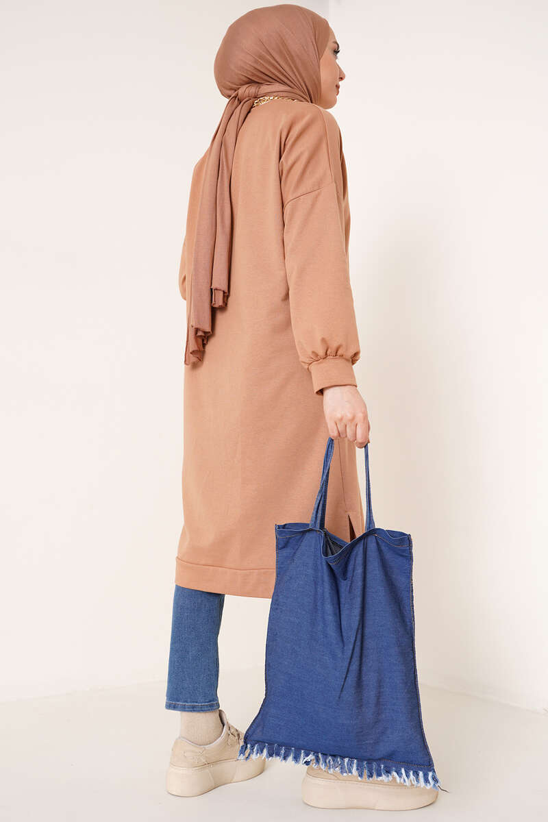Yeni sezon tunik en çok tercih edilen boyuyla dikkat çekmektedir. Uzun tuniğimizin yanları yırtmaçlıdır. Kombinlerinizde tamamlayıcı bir parça olarak kullanabileceğiniz tuniğimiz bisiklet yakadır. Sade ve salaş bir görünüm sunan tuniğimiz düşük omuz modeldir.