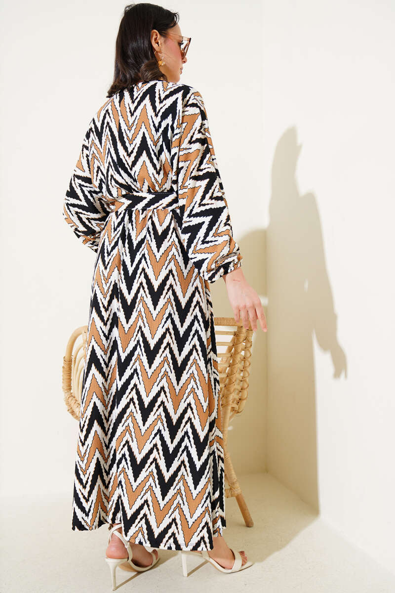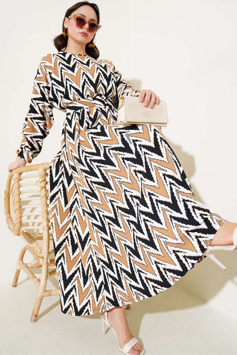 Paisley Desen Bel Lastikli Elbise Kahve