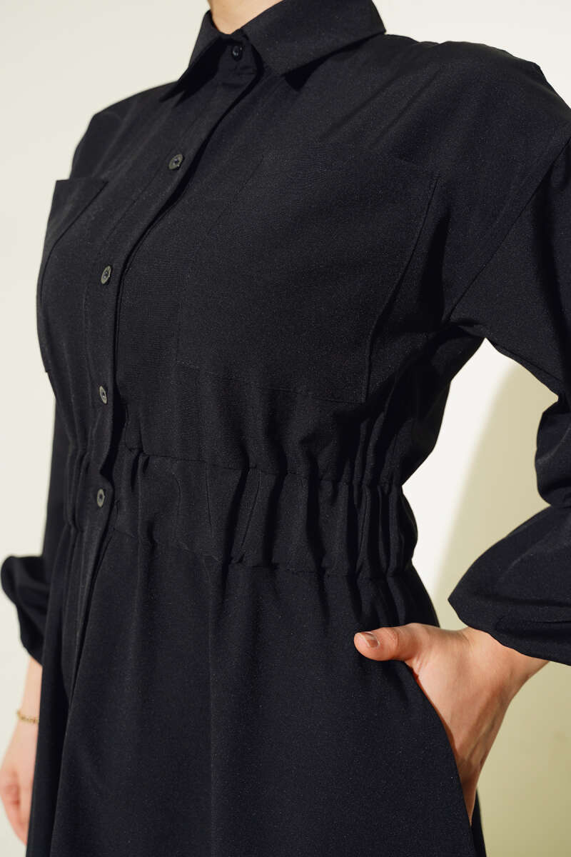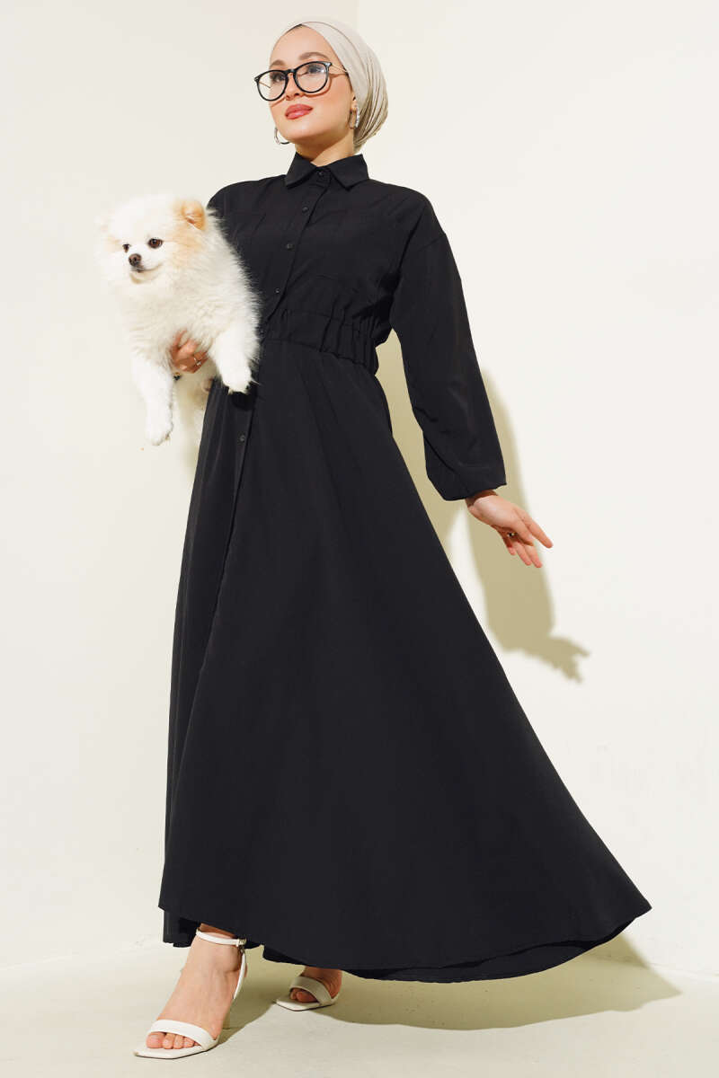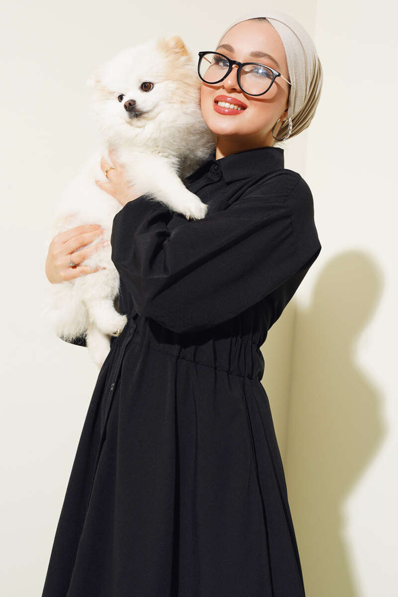 Brit Düğmeli Kuşaklı Elbise Siyah