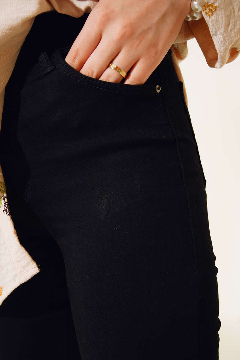 Yeni sezon kot pantolonumuz yüksek bel dar paça yapısıyla bacaklarınıza tam oturacaktır. Bel kısmında 5 kemer köprüsü bulunmaktadır. Pantolonumuzun yanlarında ve arkasında cepler bulunmaktadır.