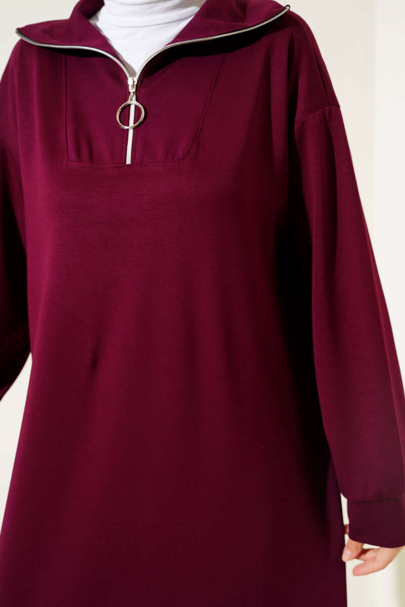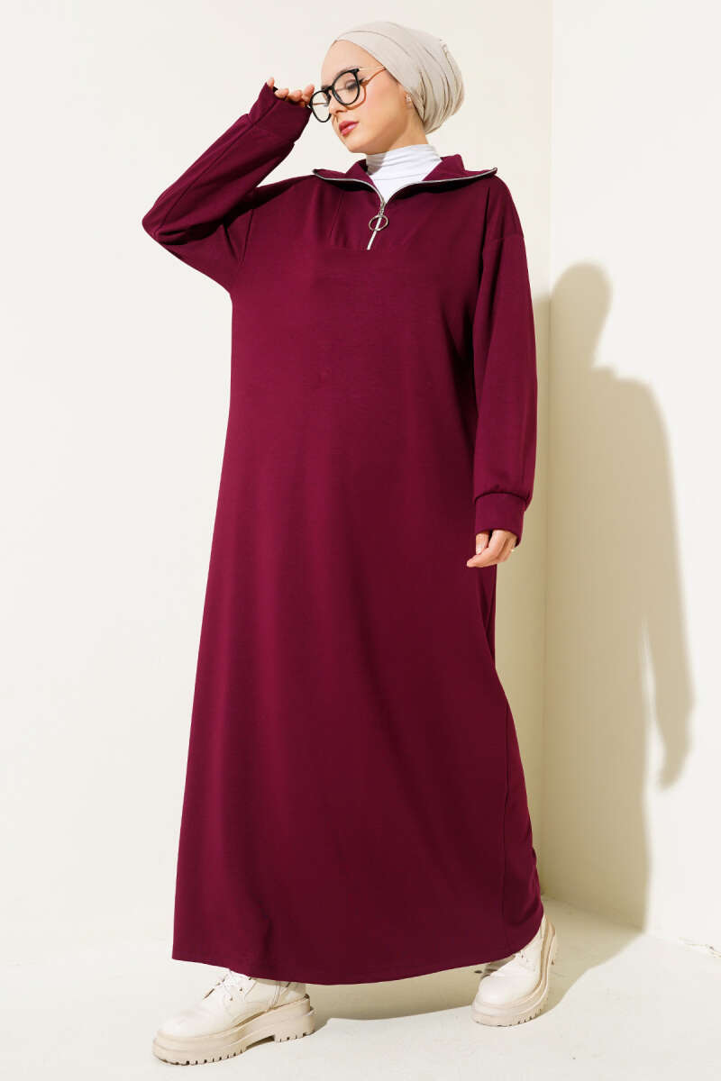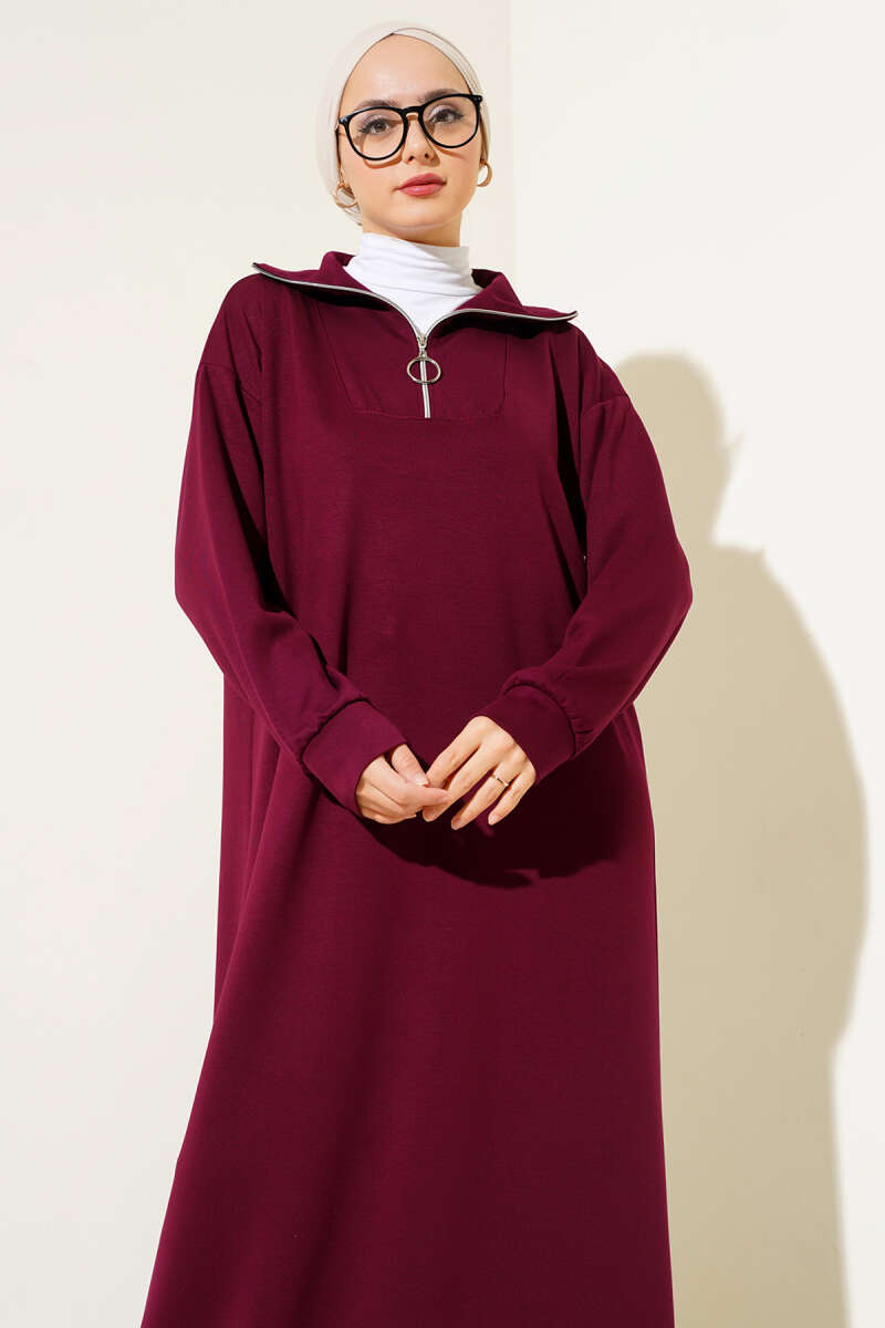 Yüksek Yaka Fermuarlı Elbise Bordo