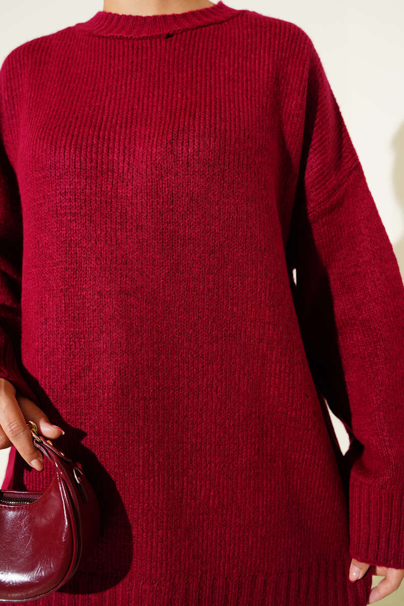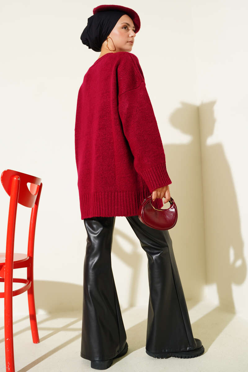 Çiçekli İnci İşlemeli Triko Kazak Bordo