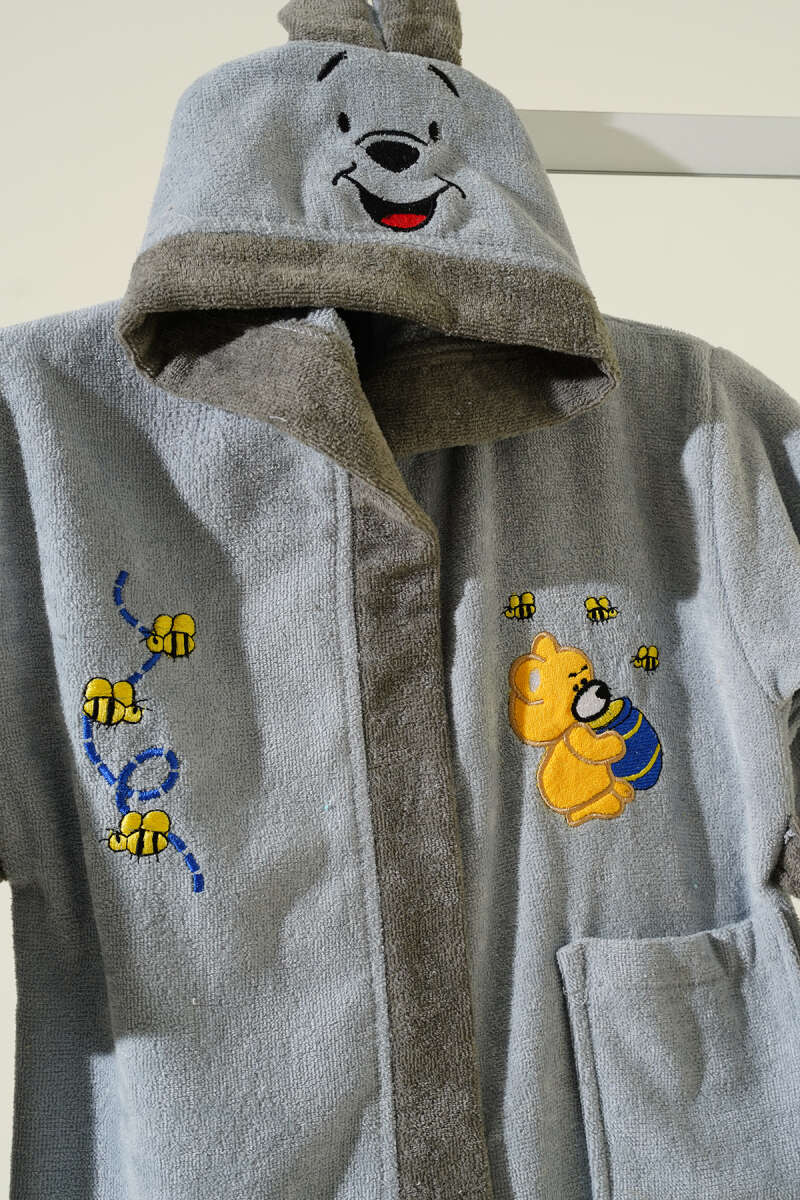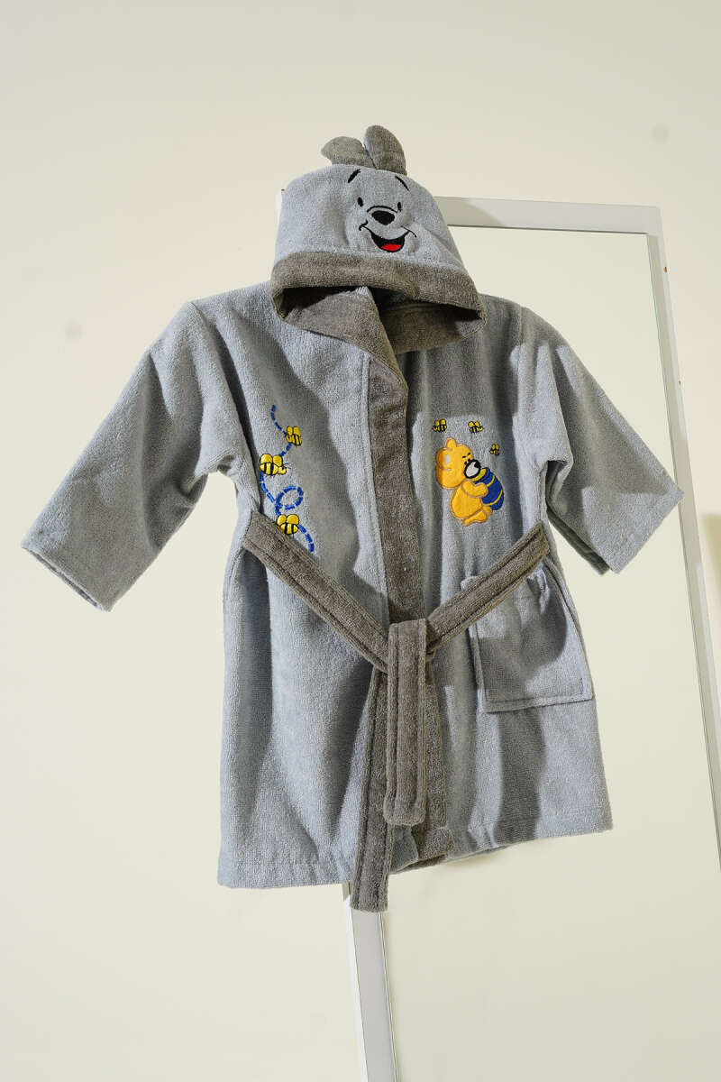 Yumuşak Dokulu Ayıcık Pooh Kapüşonlu Çocuk Bornozu Gri