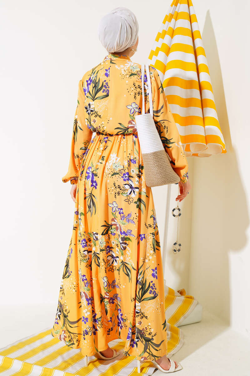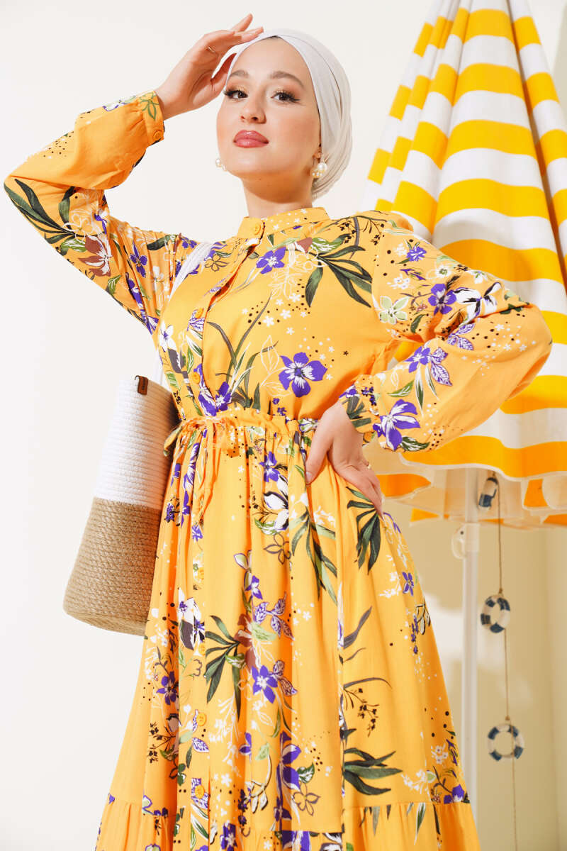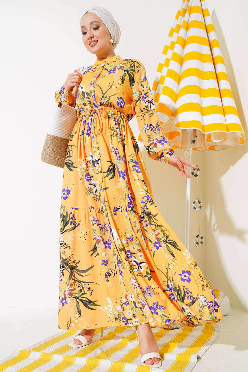Paisley Desen Bel Lastikli Elbise Lacivert