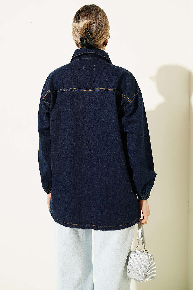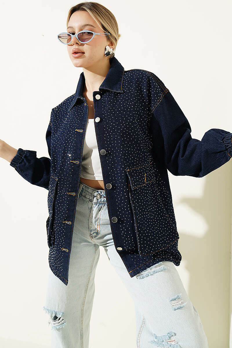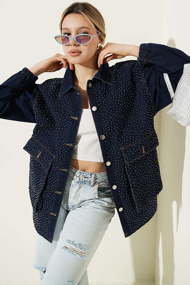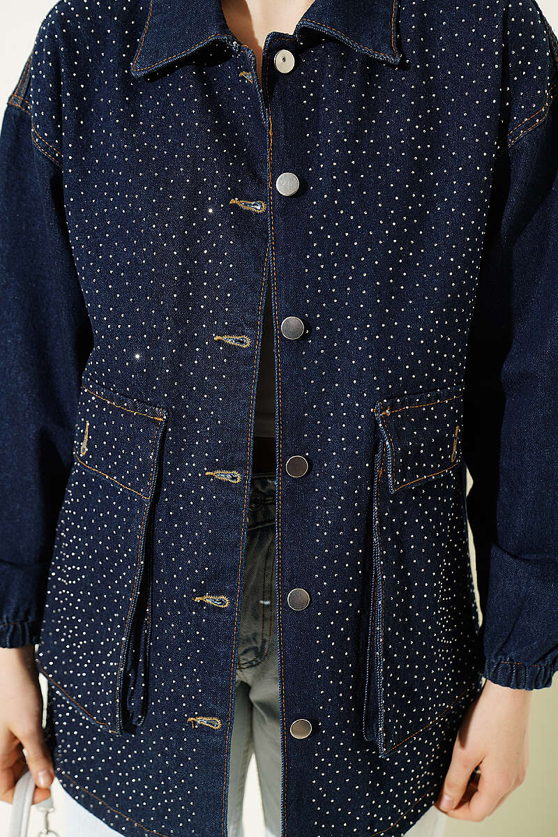 Mini Taşlı Torba Cepli Kot Ceket Lacivert
