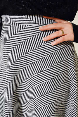 Çizgi desenli eteğimiz yandan fermuarlıdır. Siyah çizgiler eteğimize hareketlilik kazandırmıştır. Eteğimiz kemersiz olup içi astarsızıdır. Kombinlerinizde rahatlıkla kullanabileceğiniz çizgili eteğimiz dolabınızda yerlerini beklemektedir.