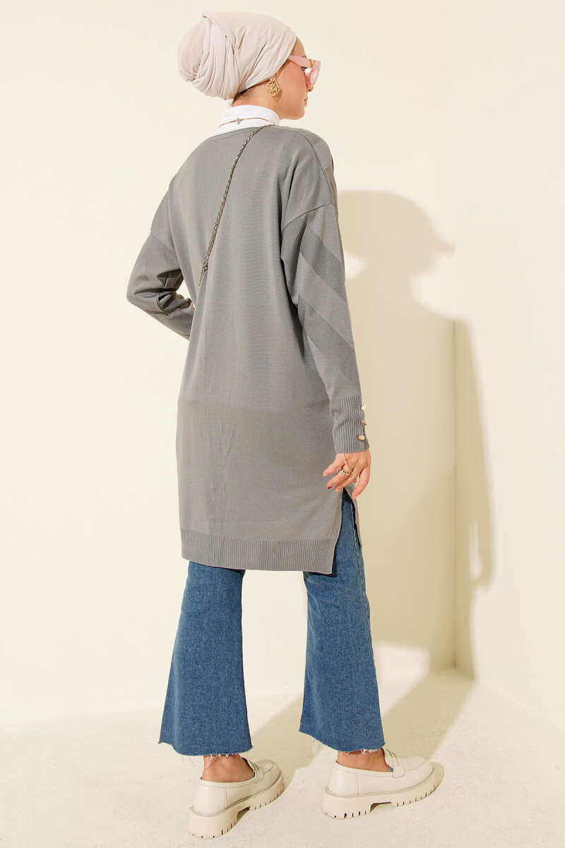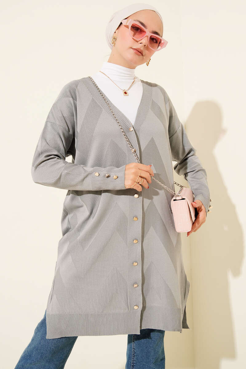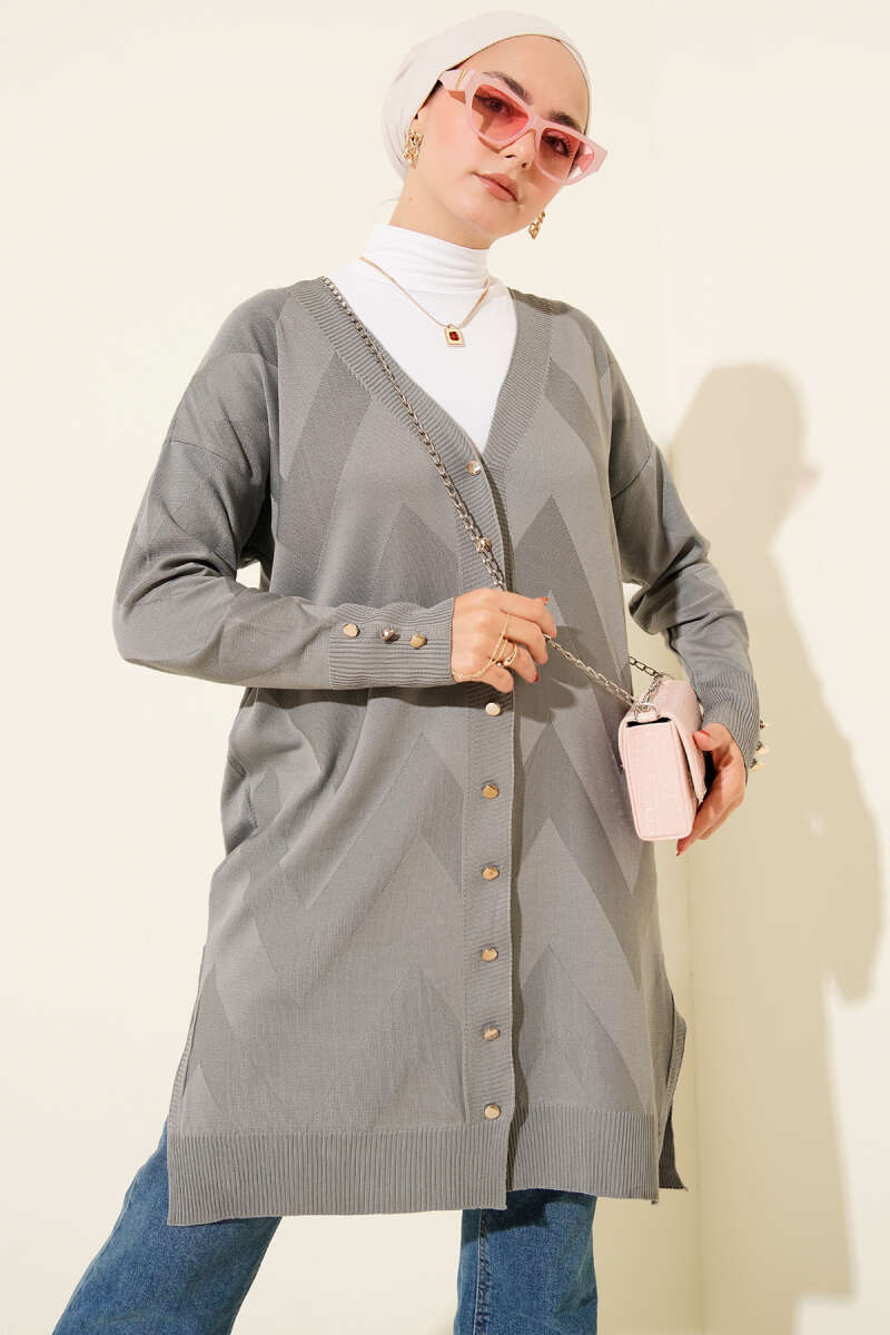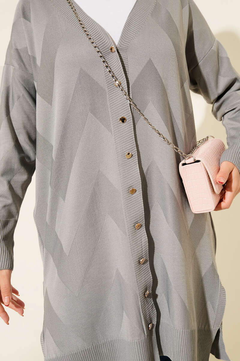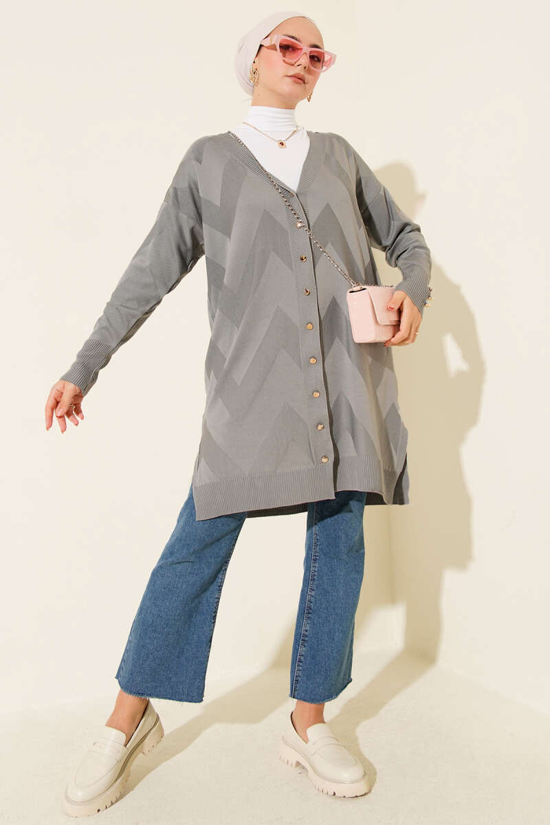 Zigzag Desenli Düğmeli Merserize Hırka Gri