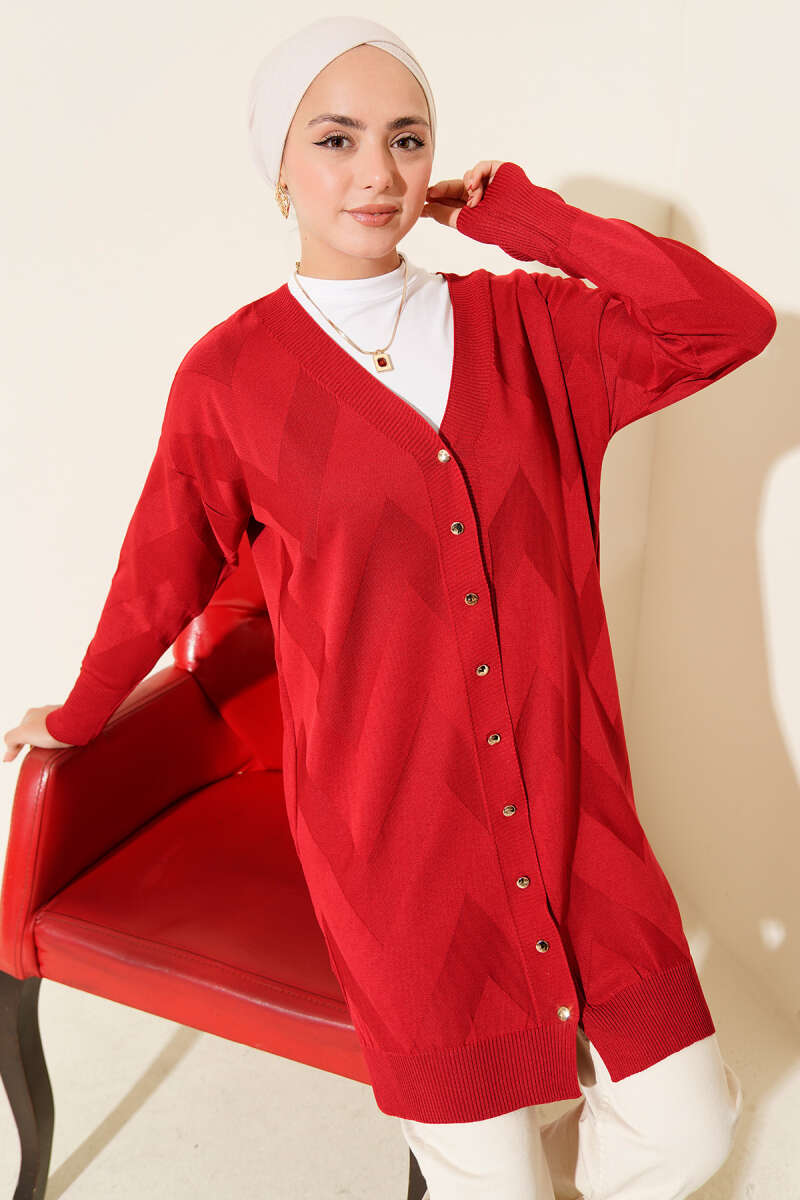 Zigzag Desenli Düğmeli Merserize Hırka Kırmızı