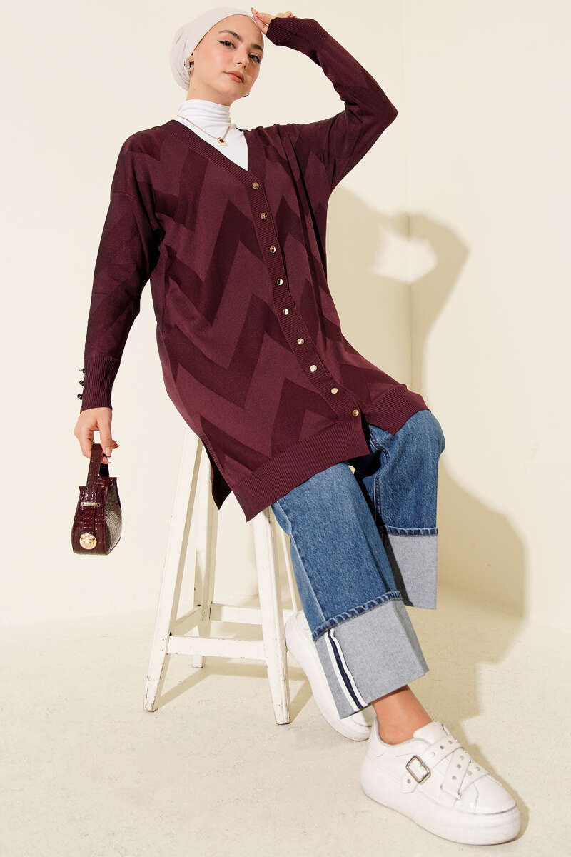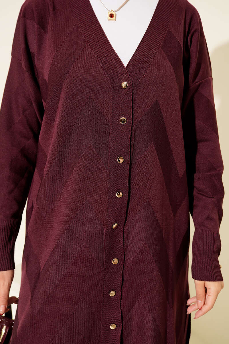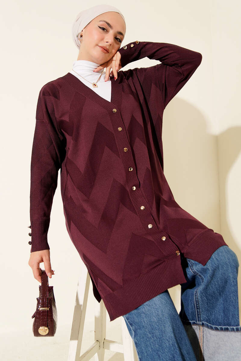 Zigzag Desenli Düğmeli Merserize Hırka Mürdüm