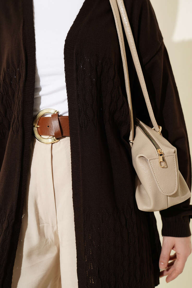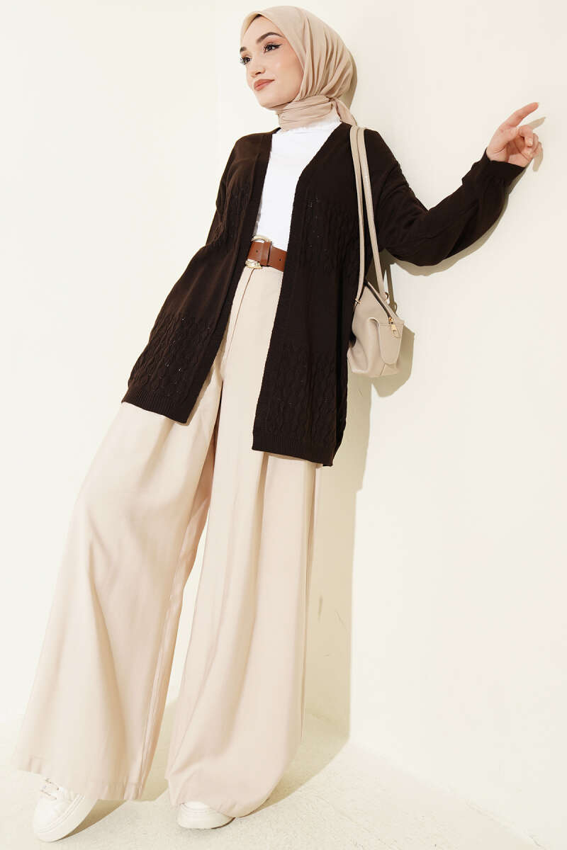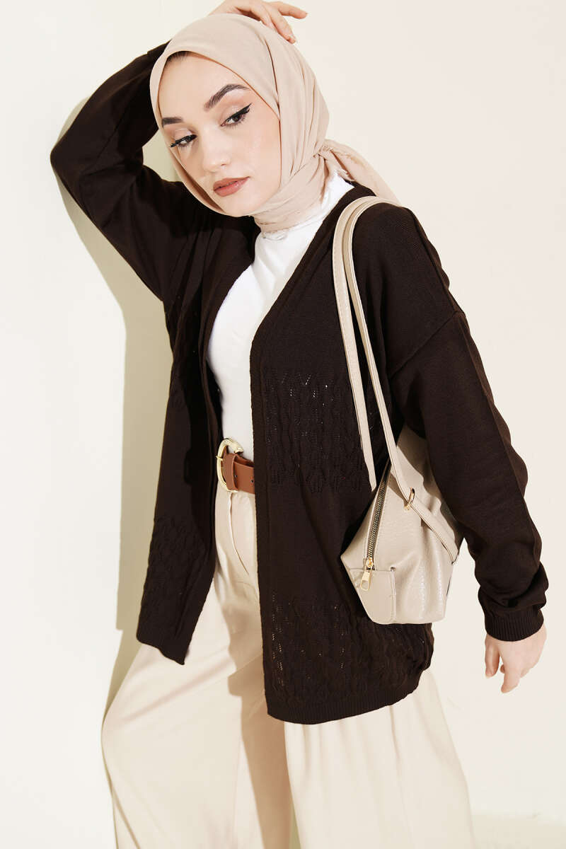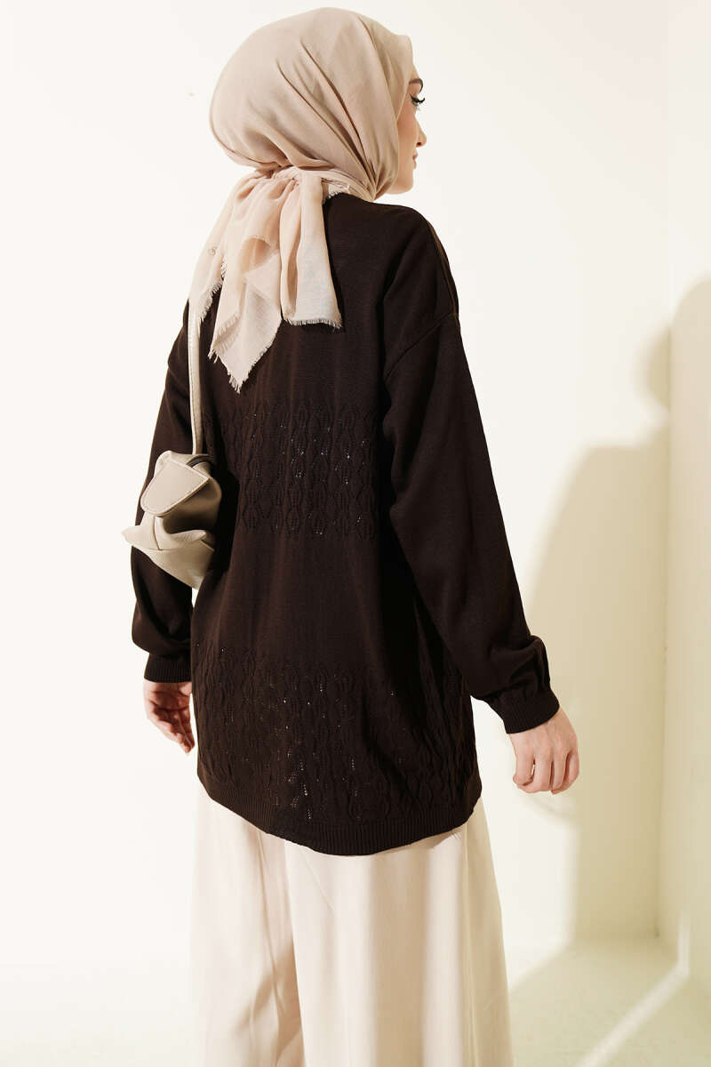 Delikli Uzun Triko Ajur Hırka Kahve