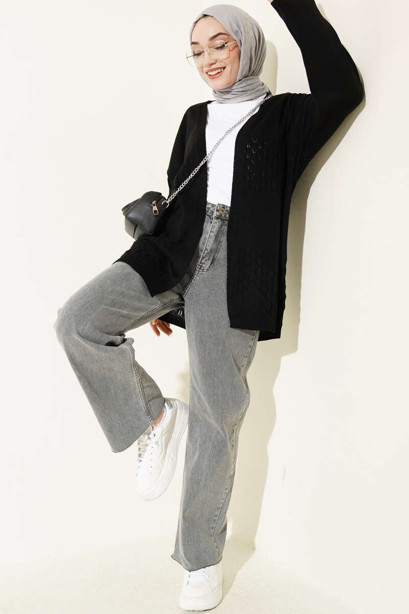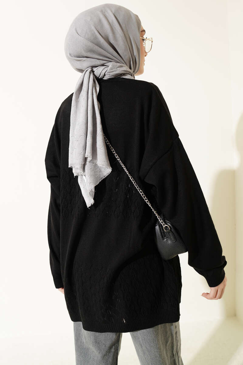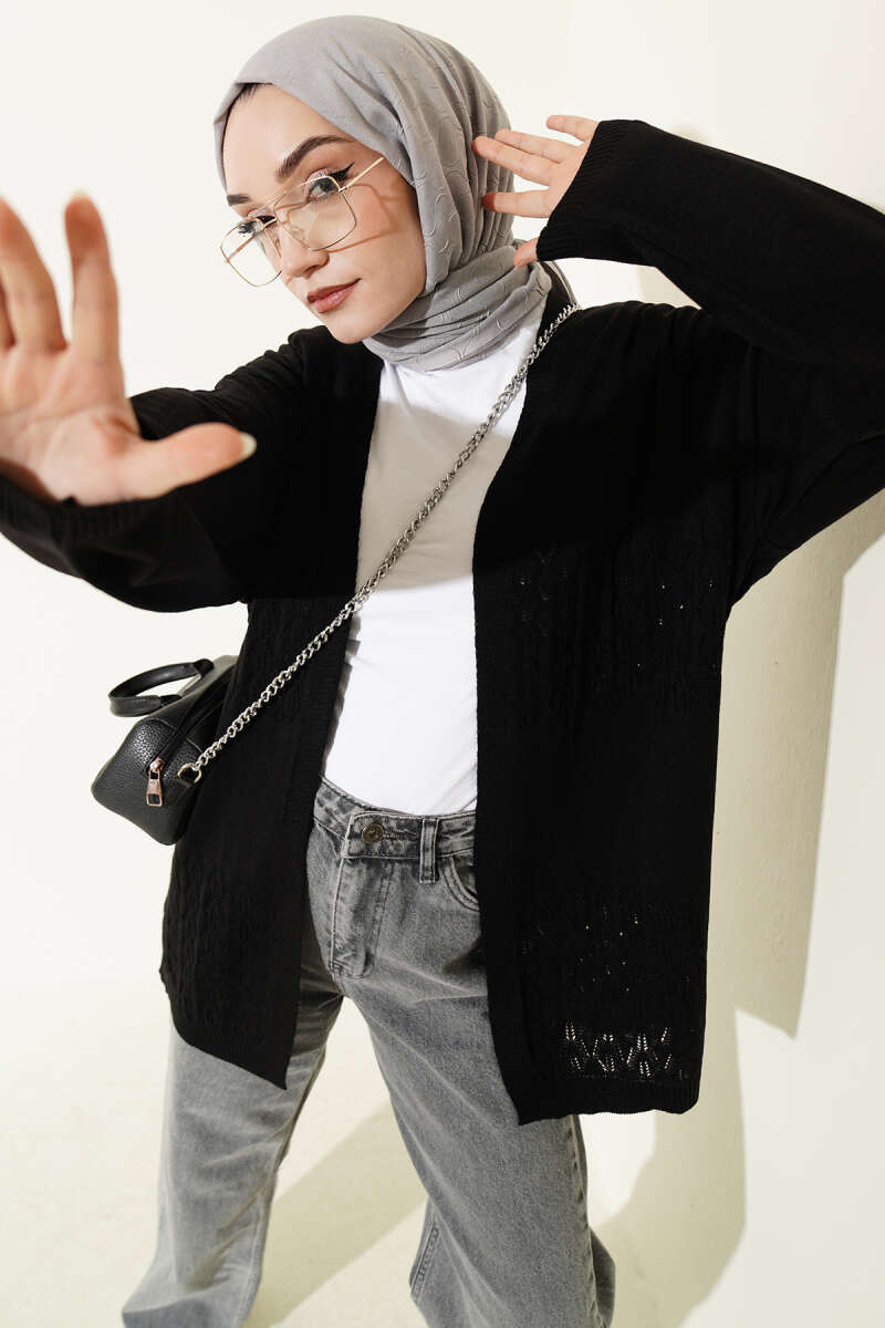 Şerit Desen Ajurlu Triko Hırka Siyah