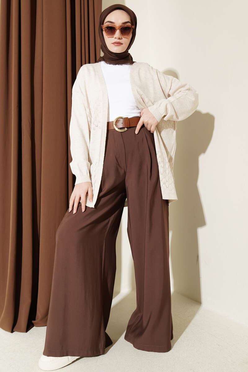 Delikli Uzun Triko Ajur Hırka Kahve