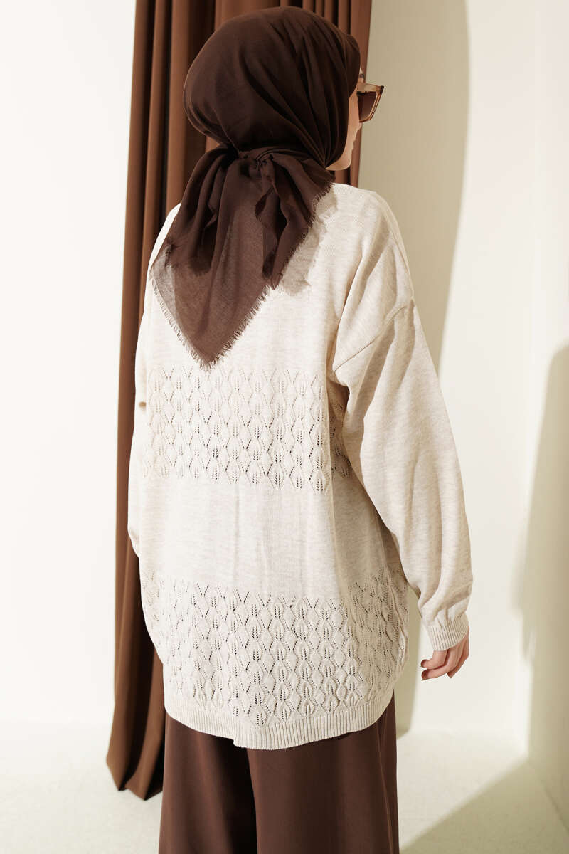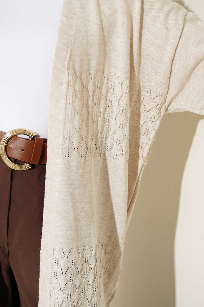 Şerit Desen Ajurlu Triko Hırka Taş