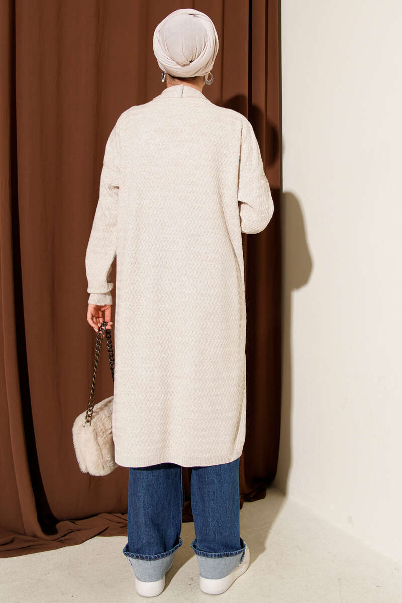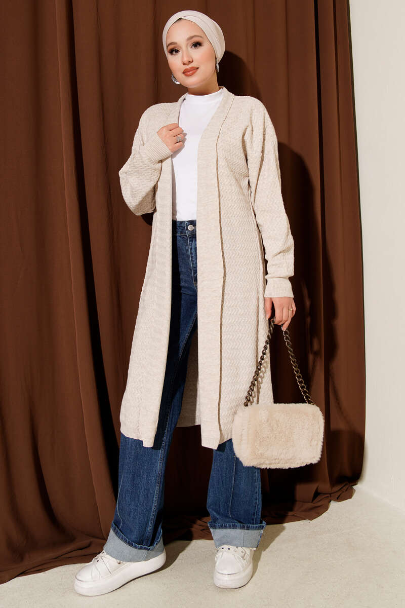 Şal Yaka Örgü Desenli Uzun Triko Hırka Taş