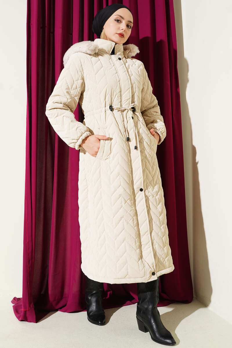 Zigzag Kapitone Kapüşonlu Şişme Mont Bej