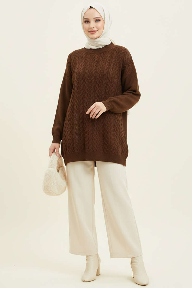 Önü ve Kolu Taş Süslemeli Elbise Taba