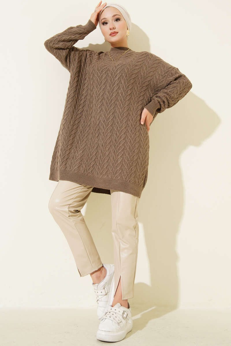 Kiraz Salkımlı Kabartma Yumoş Triko Tunik Latte