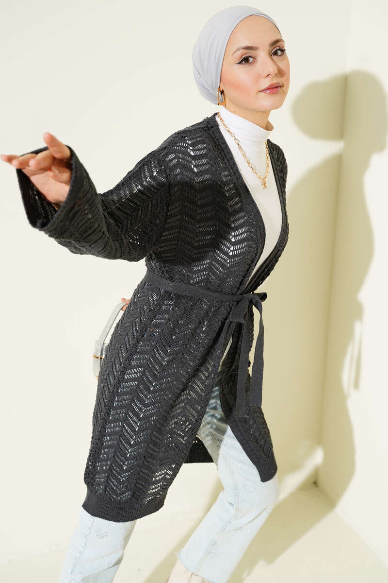 Zikzak Ajurlu Kuşaklı Triko Hırka Gri