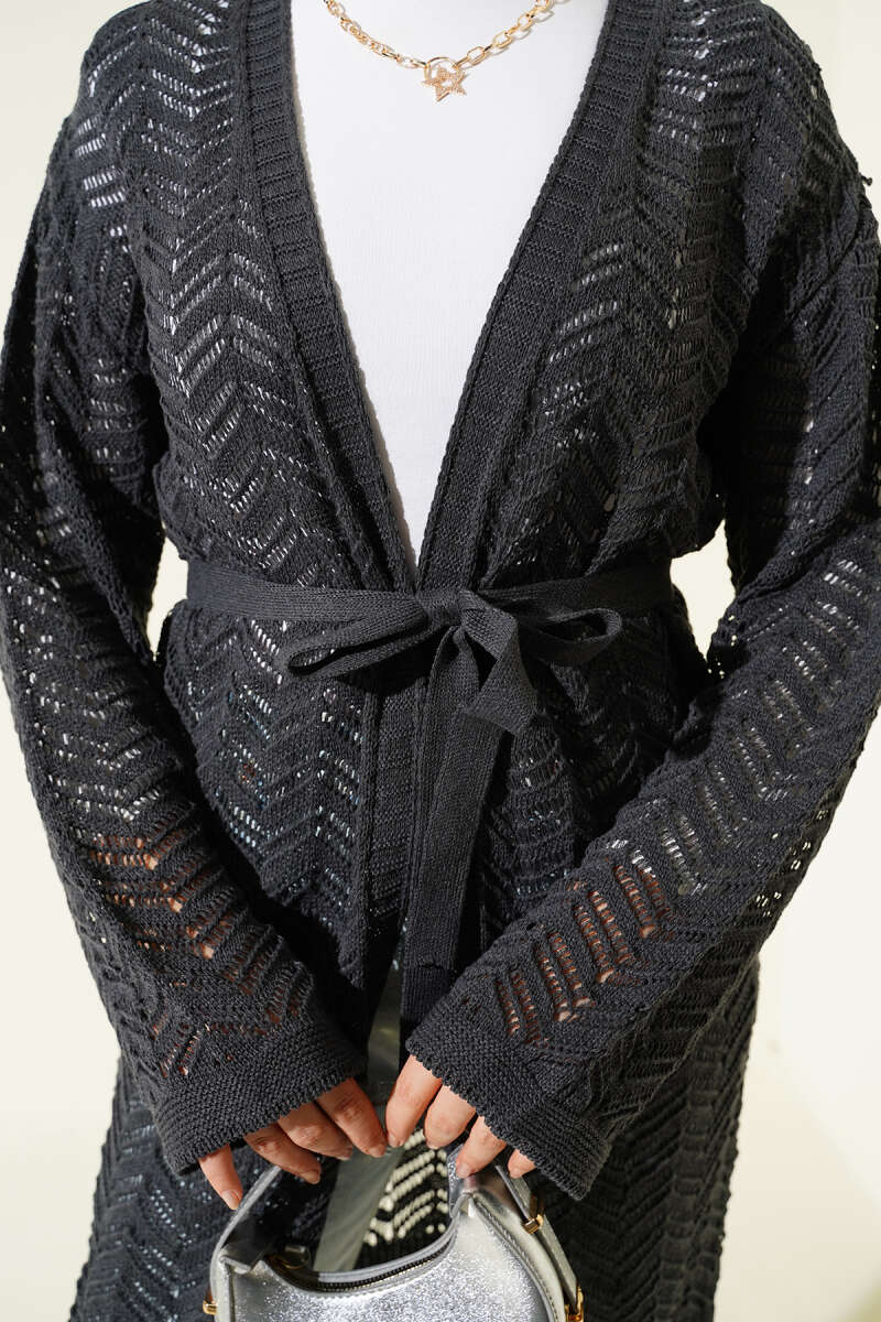Zikzak Ajurlu Kuşaklı Triko Hırka Siyah