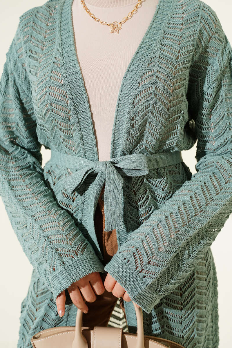 Zikzak Ajurlu Kuşaklı Triko Hırka Çağla Yeşili