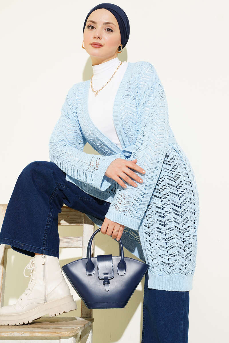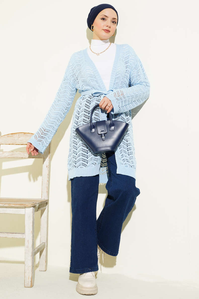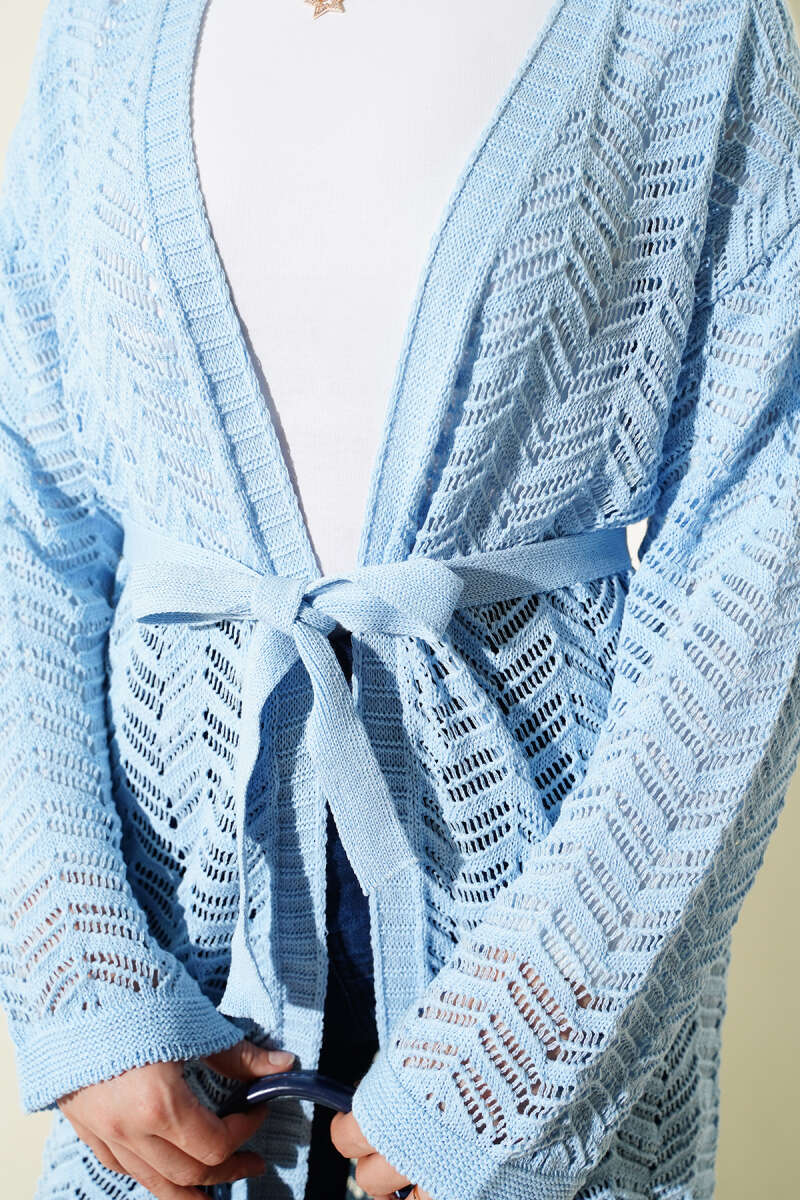Zikzak Ajurlu Kuşaklı Triko Hırka Çağla Yeşili