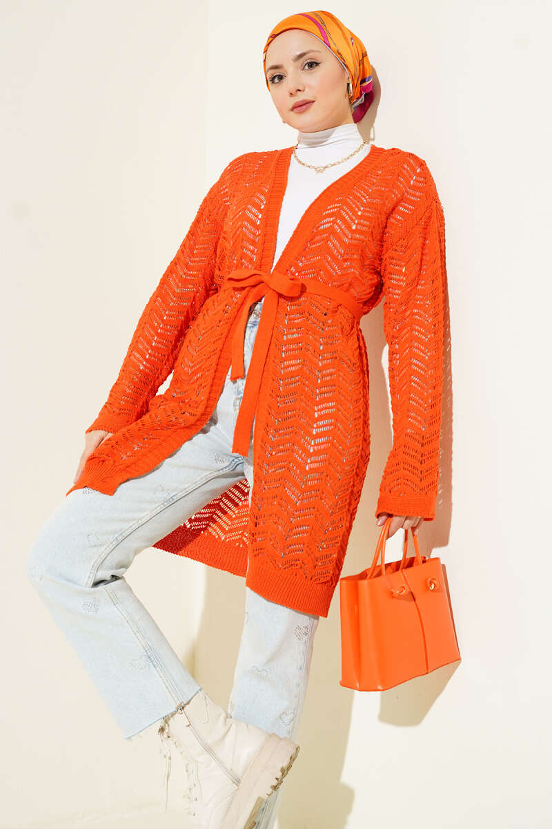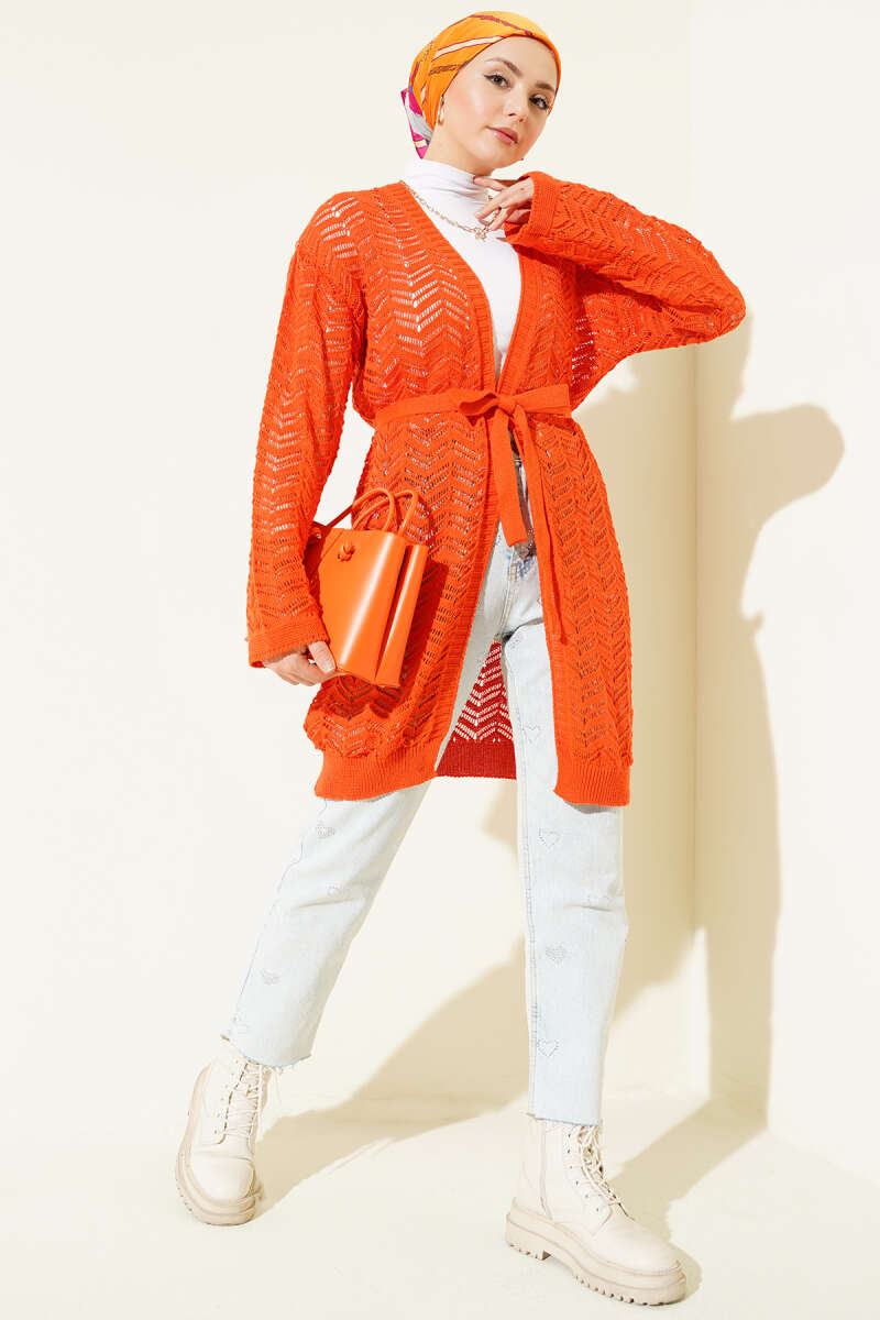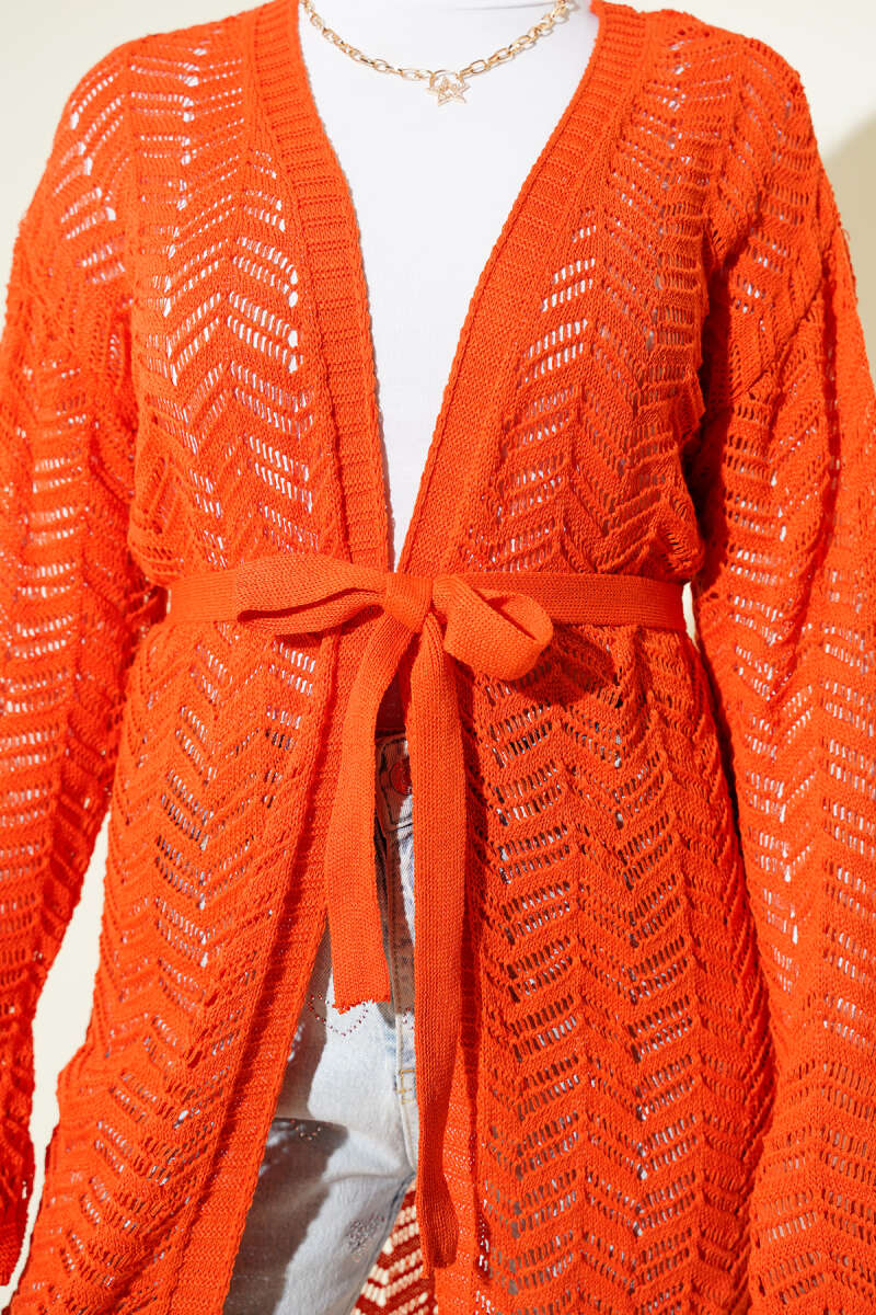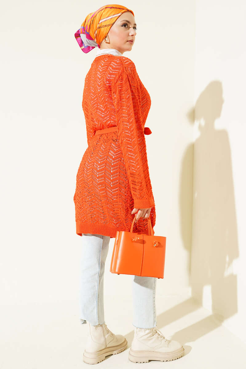 Zikzak Ajurlu Kuşaklı Triko Hırka Oranj