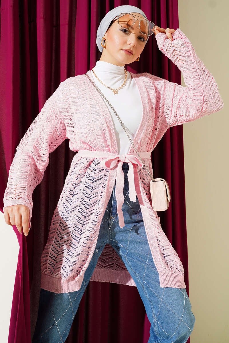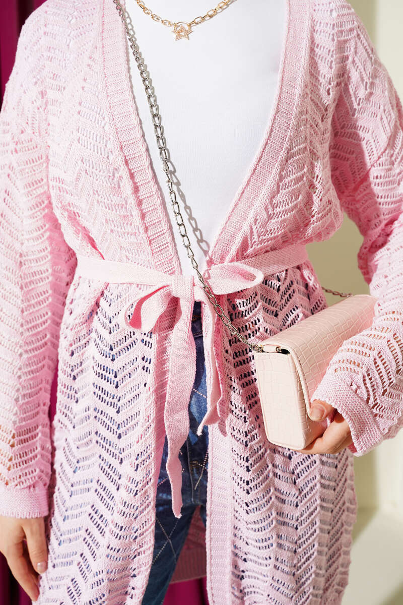 Zikzak Ajurlu Kuşaklı Triko Hırka Pembe