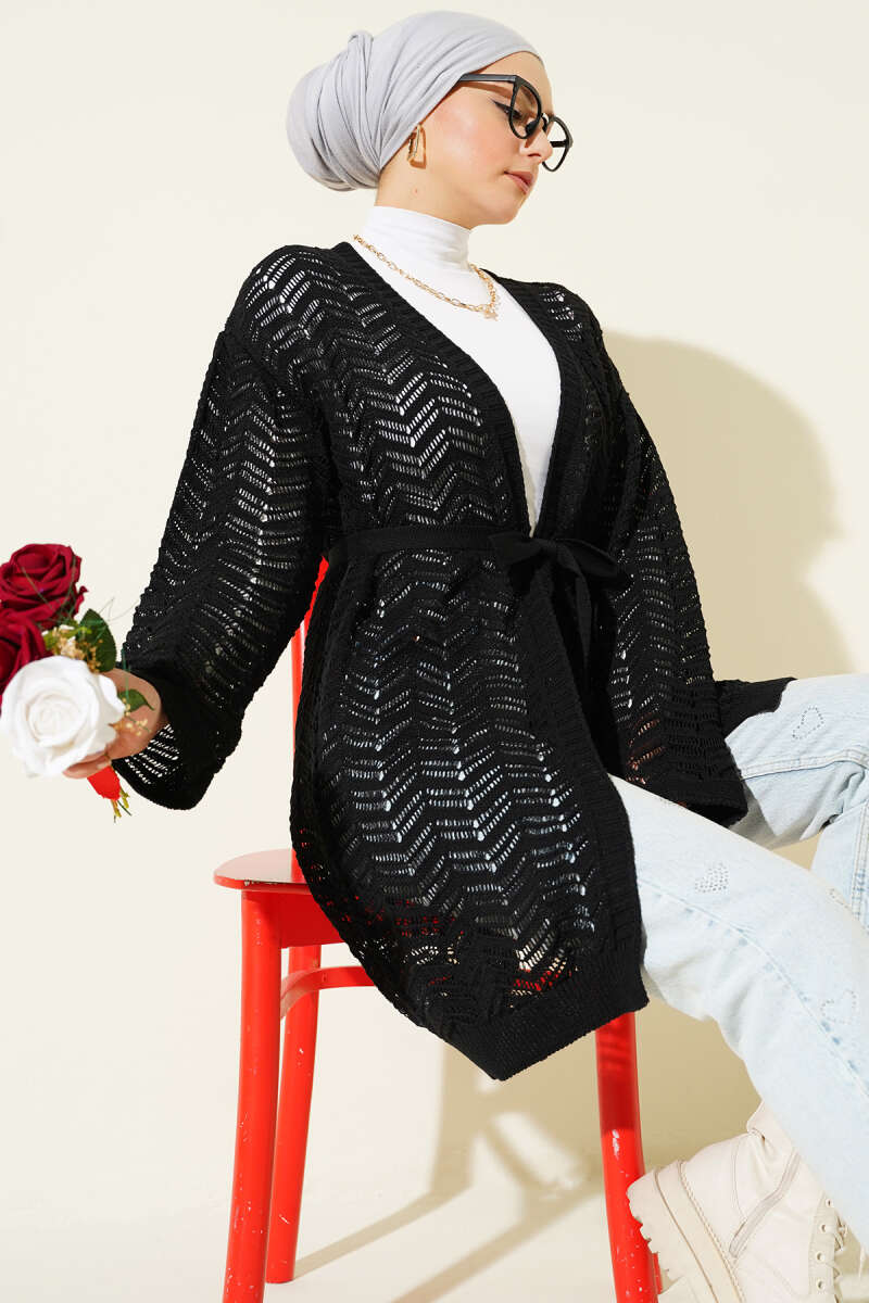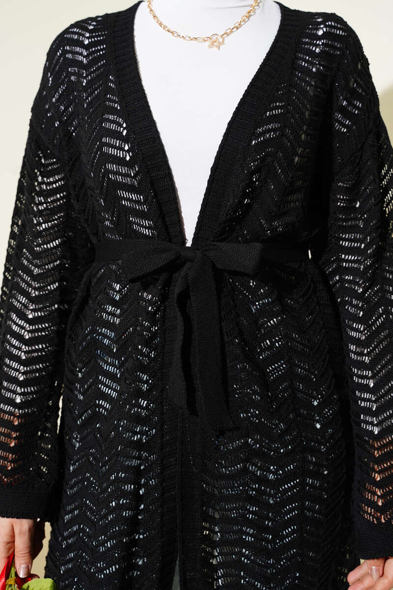 Zikzak Ajurlu Kuşaklı Triko Hırka Siyah